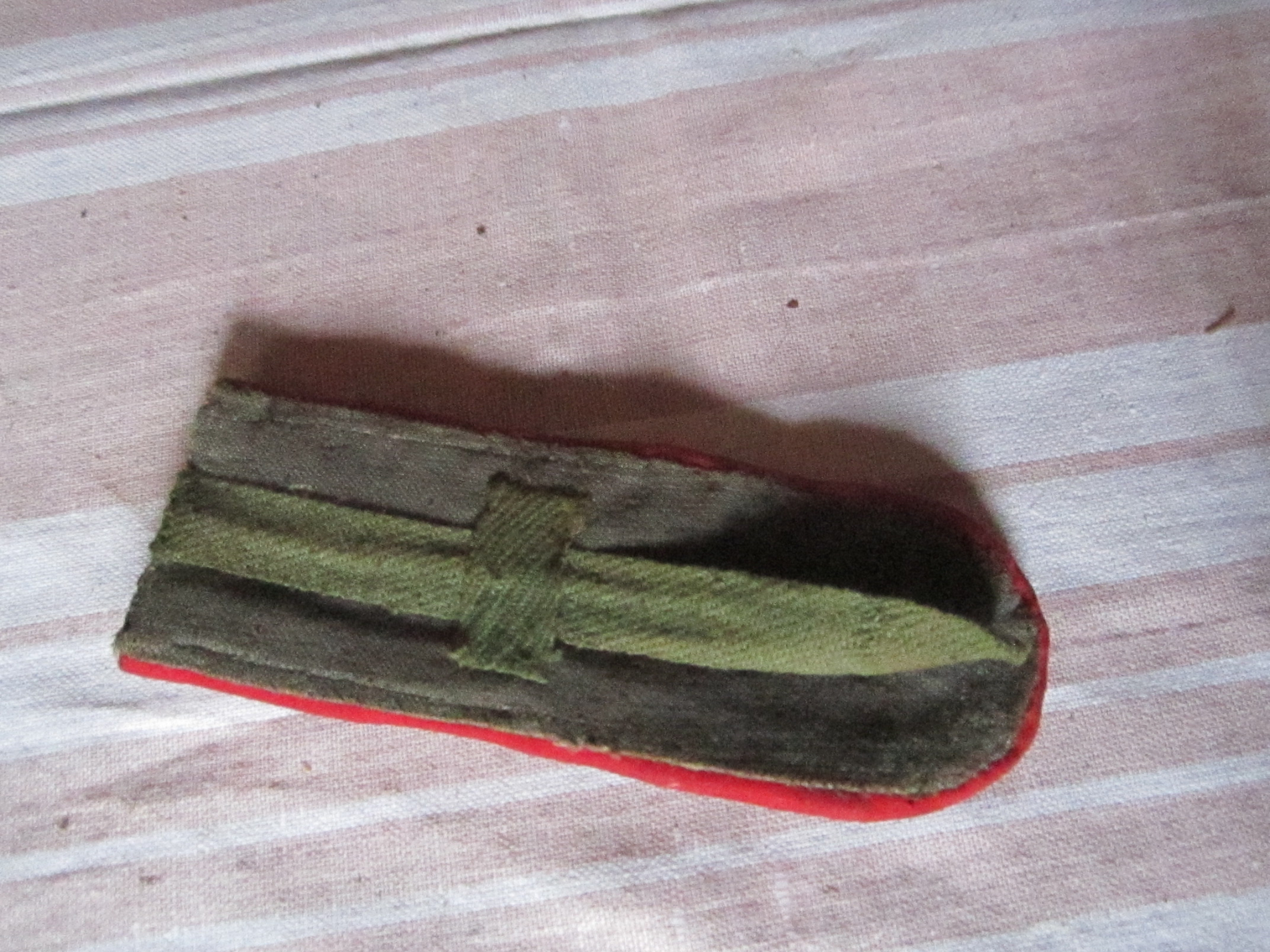 T eine pagun 13cm. pikk,laius4,5cm. Ümbritsetud punasese randiga, ümber (paguni peal)jookseb1cm.laiune kuldne põimitud lint ja paguni keskel on kuldne punutud kitsas triip mustal pinnal.