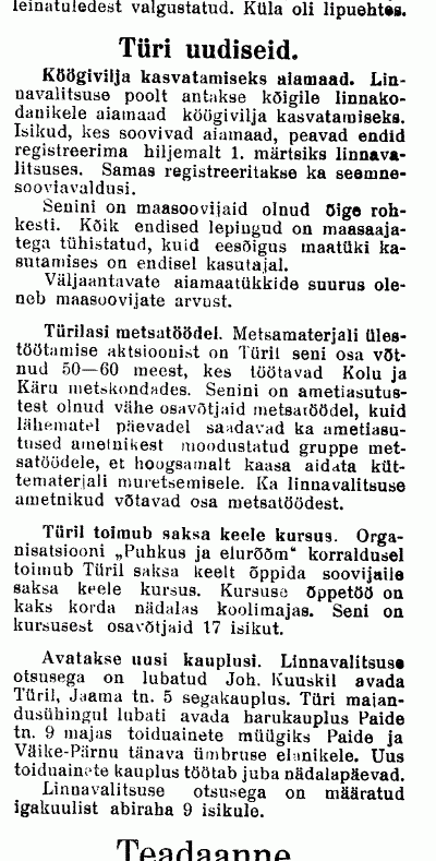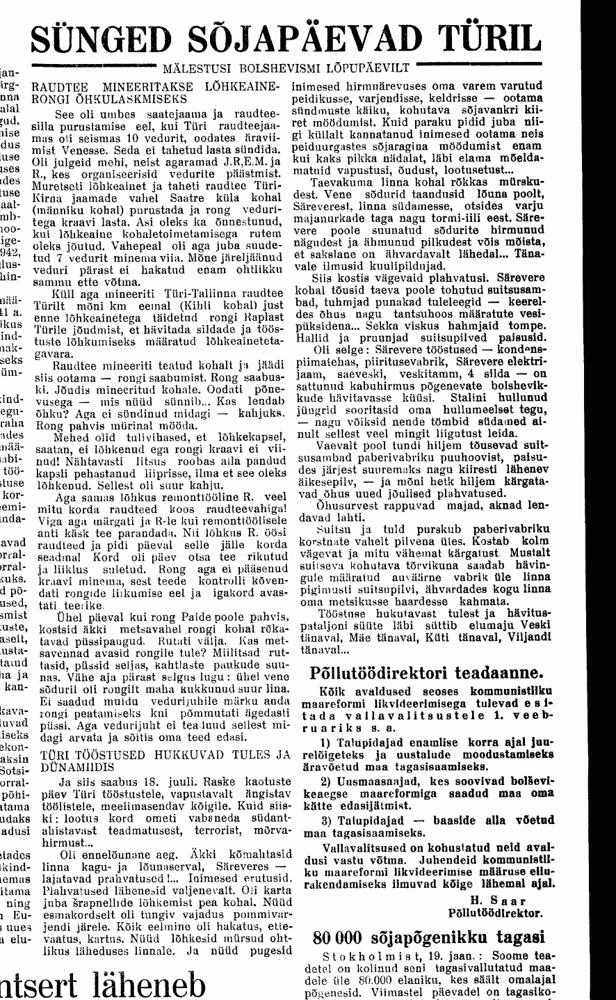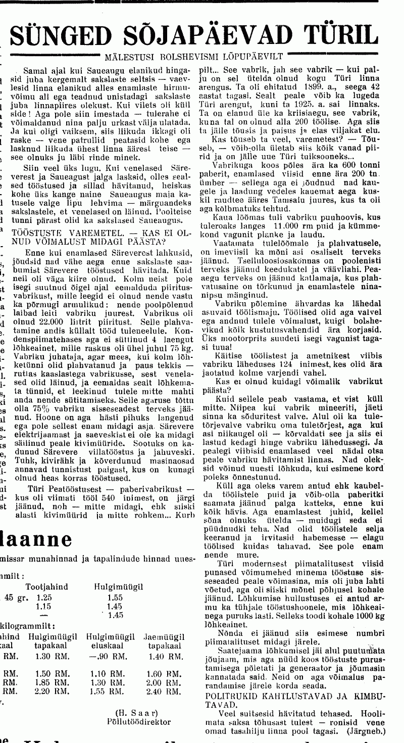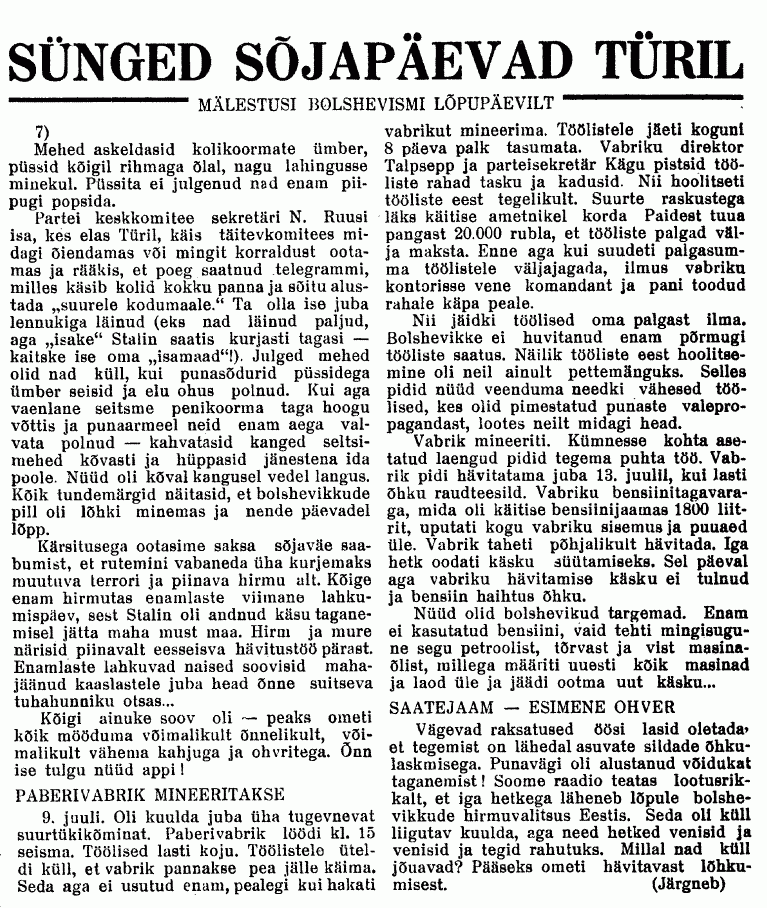 "/.../ Türi saatejaama ülem oli sakslane Schnellewald. Personali hulka kuulusid poliittöötajad Grabers ja Wunschkun, saatetehnikud Herbert Vessar, Voldemar Kivisepp ja Ants Kajandi, valveametnikus Arvi Sidron, Johannes Mikkola ja õpilane Järv/.../"