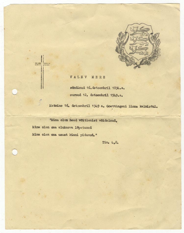 Informatsioon on võetud Reet Naber’i koostatud raamatust „Eesti Merejõudude juhatajad 1918 – 1940“. Samas raamatus on surmadaatumiks märgitud 16.12.1949 ja Eesti ohvitseride andmebaasis hoopis 30.12.1949. Tegelikult suri Valev Mere 12. detsembril 1949 ja neli päeva hiljem, 16.12.1949, toimus tema matusetalitus.