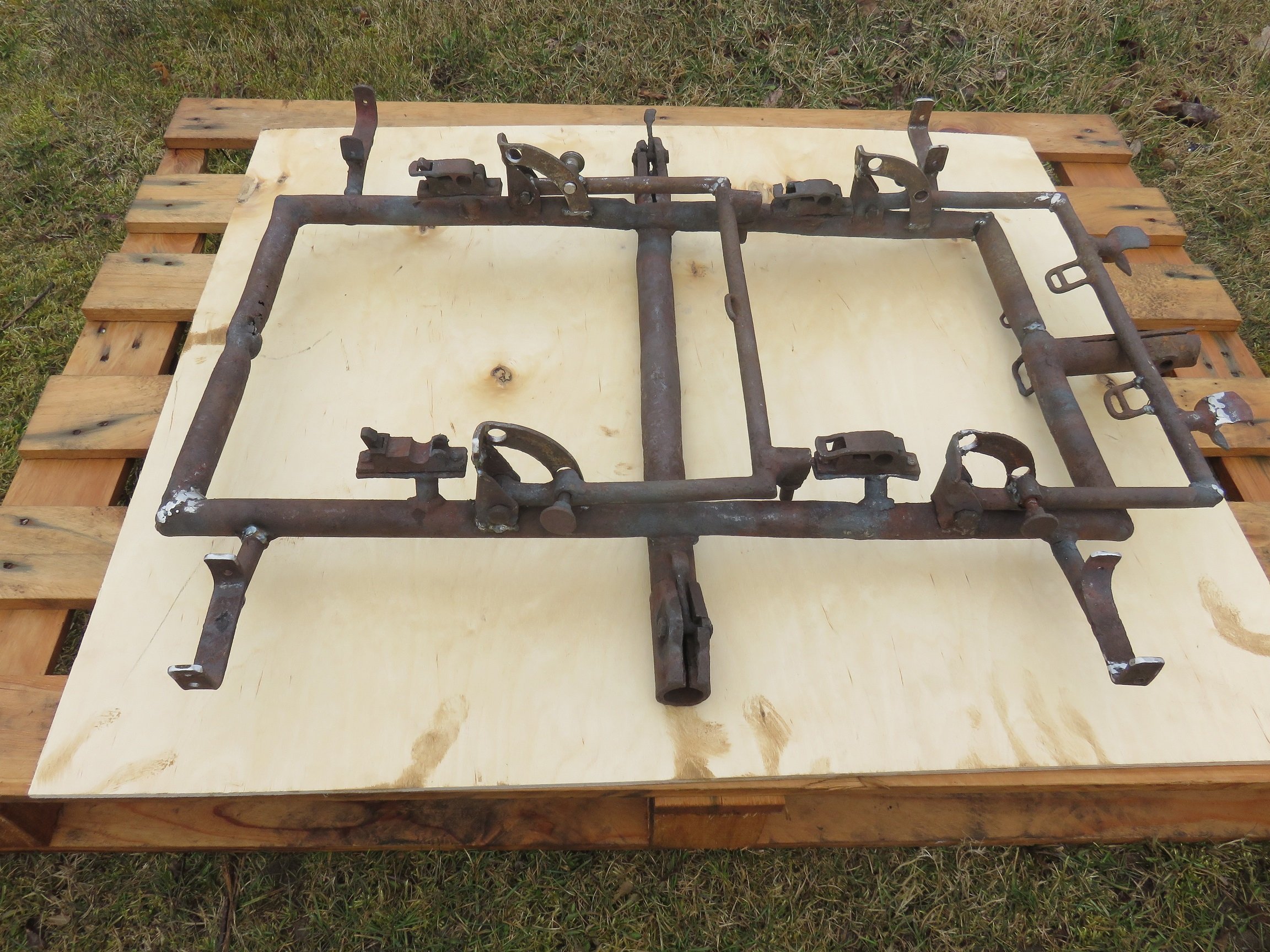 Mõõdud:140x10x2,5cm Isolaatorid olevat lapsed kabenuppudeks ära kruttind. :D Pärit Tartu ja Alatskivi vahelt, kus Austerlased veoautosid remontisid. Sealt välja tulnud veel: Erineva suurusega maantus vardad, rauast kangid, akusoojendus lamp, Itaalia telkmantlid, bakeliit lambid, termokast koos sisuga, sidetraadi riputus konksud, aku, kokkukäivad rauast lauajalad(peale olevat käinud vineer) .......rohkem hetkel ei mäleta. Pidi veel olema bakeliidist-plastmassist mingi kettaga staabi? telefon.