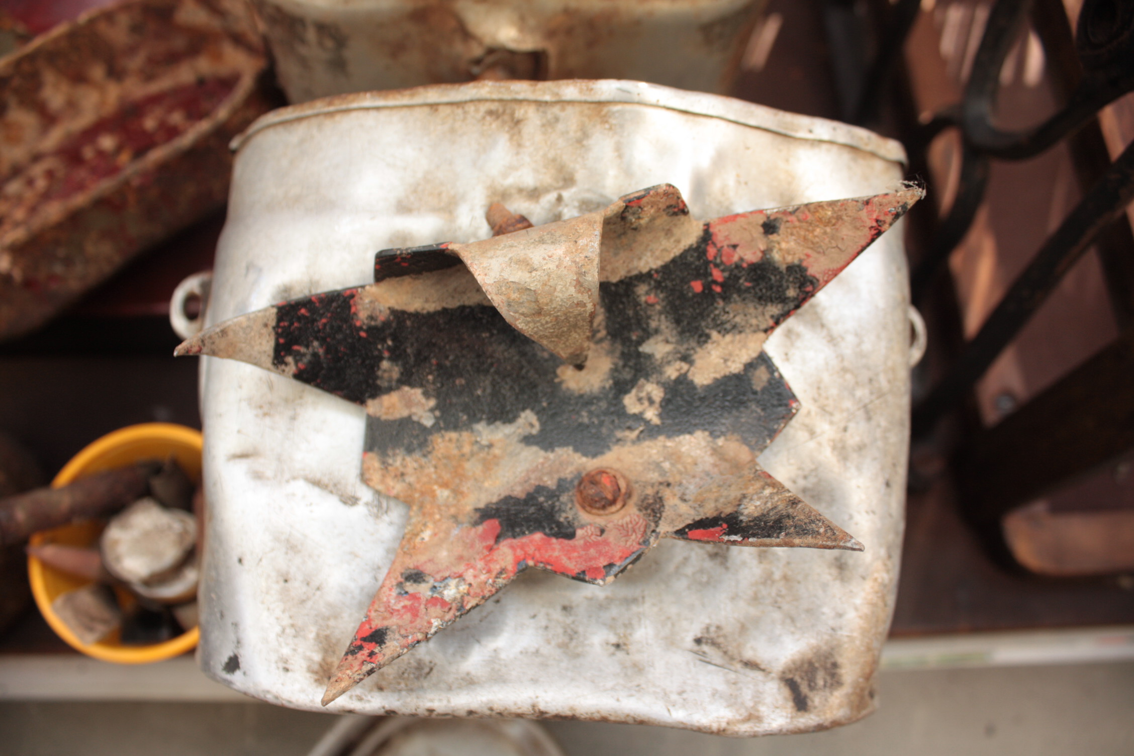 Paar aastat tagasi suvila juurest teeäärsest kruusavallist leitud viisnurk. Paksust alumiiniumist plekikääridega välja lõigatud, algselt mustaks, seejärel punaseks värvitud. Tipust tippu ca 15cm, olnud kinnitatud millegi külge kahe kruviga. Esimese jõledusena kargas pähe punaste hauatähise element, aga kuna lähikonnas teadaolevalt kedagi maetud pole, siis äkki õnelt masinalt pärit?