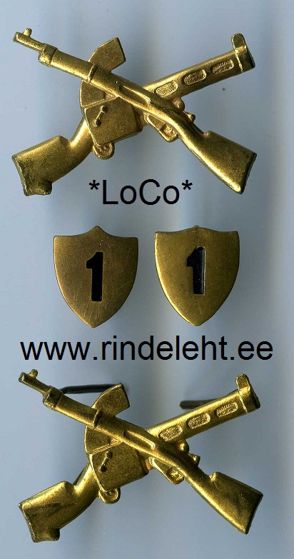 Ühele mõrvatud Eesti leitnandile kuulunud tunnusmärgid. Pöörake tähelepanu sellele, et 1.jalaväerügemendi trafaretid on erinevad. Vasakpoolsel on nr. 1 peale värvitud ja parempoolsel on nr. 1 süvisega.