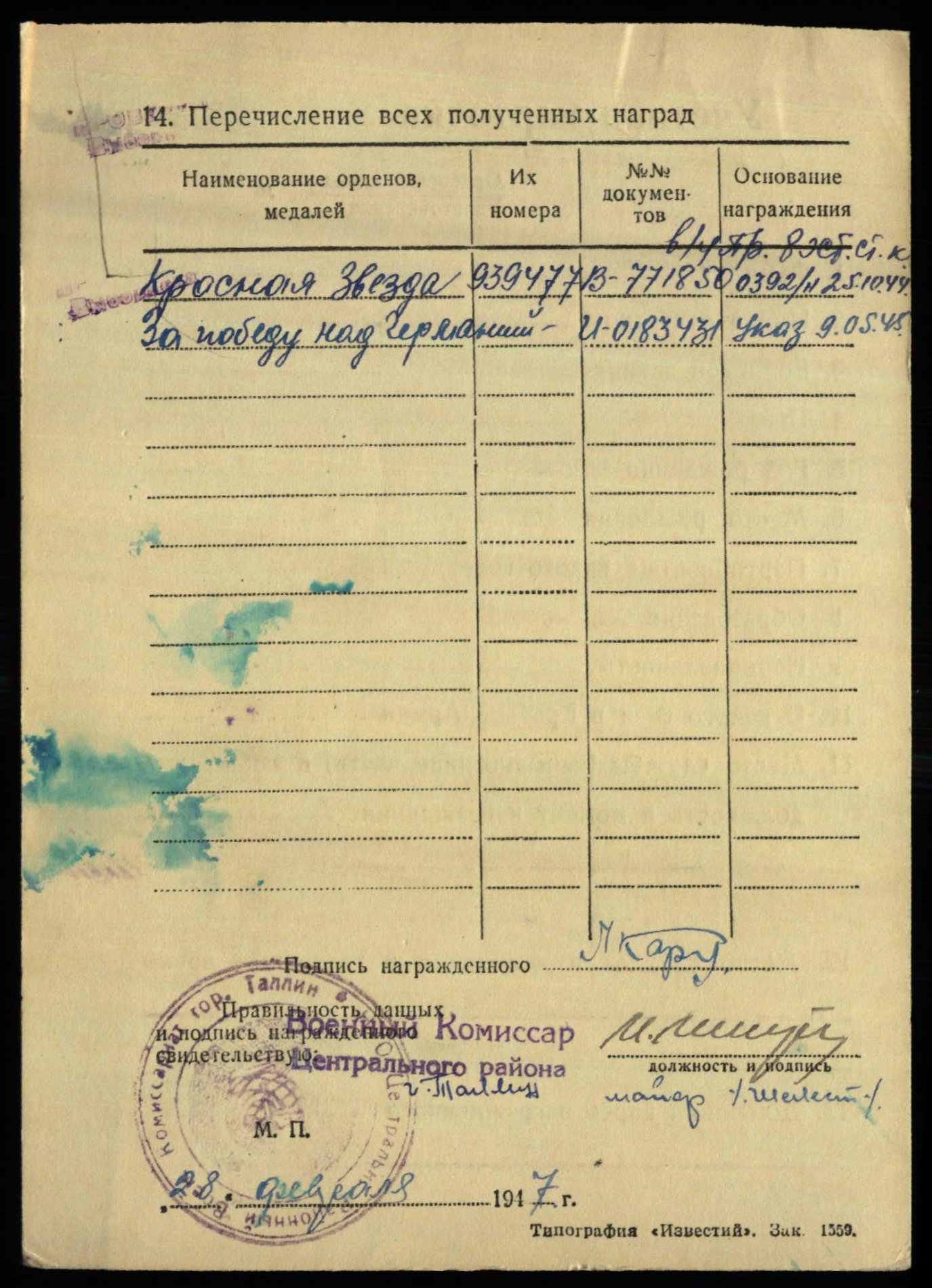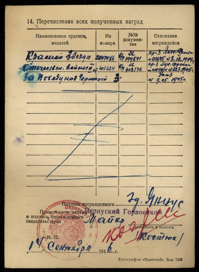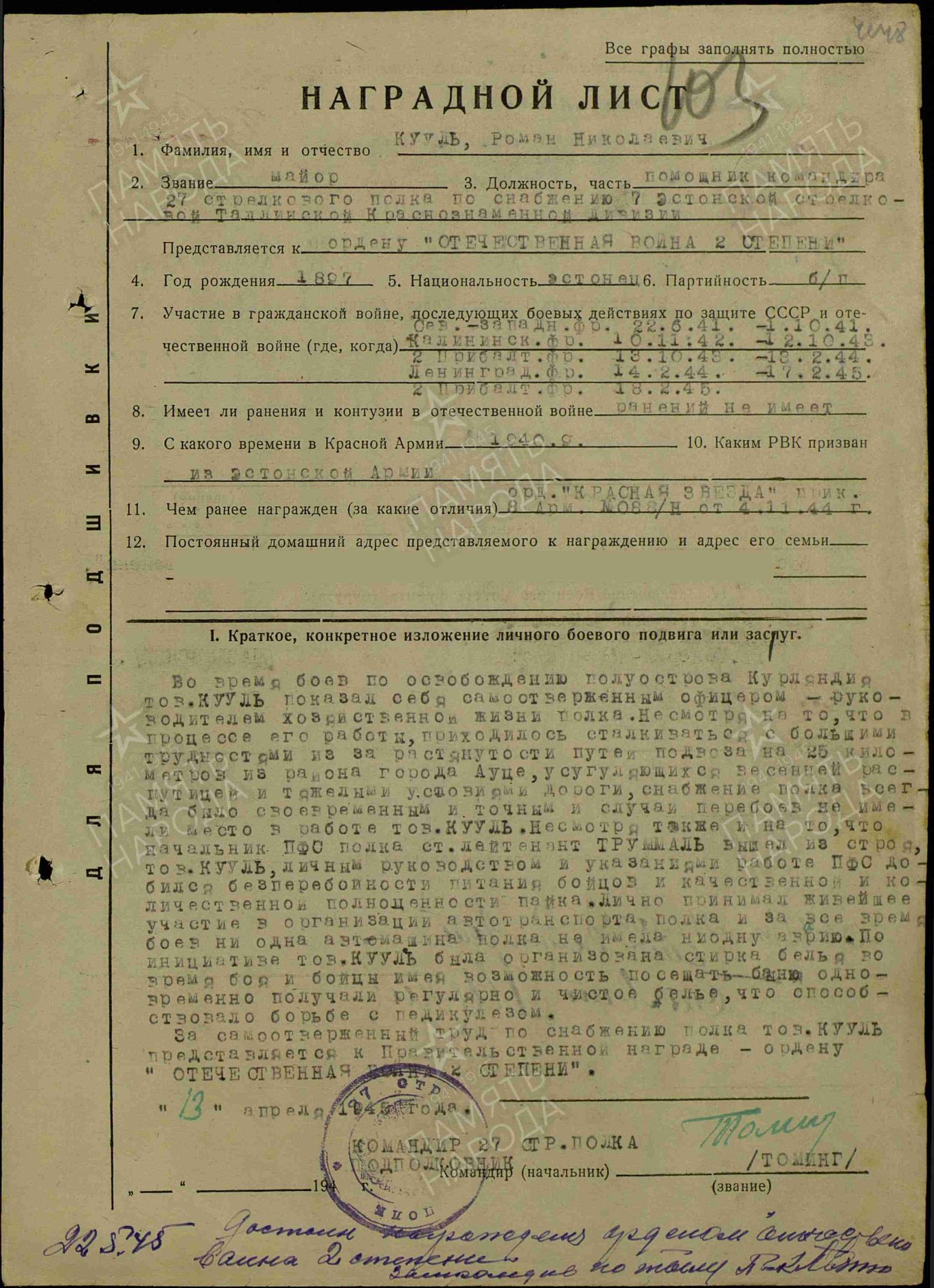 Kiire tõlge Punatähe ordeni autasulehelt ( ilmselt on sellel osade vaenupoole üksuste numbritega eksitud, võib täpsustada ):