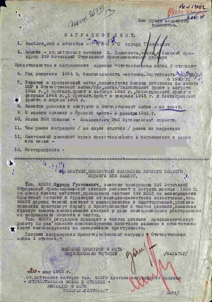 249. Laskurdiviisi sõjaprokurör 1943. aastast, justiitsteenistuse vanemleitnant Jannus. II klassi Isamaasõja ordeni nr. 415624 kavaler. Orden on originaalkarbis ja kantud on seda minimaalselt, kui üldse.