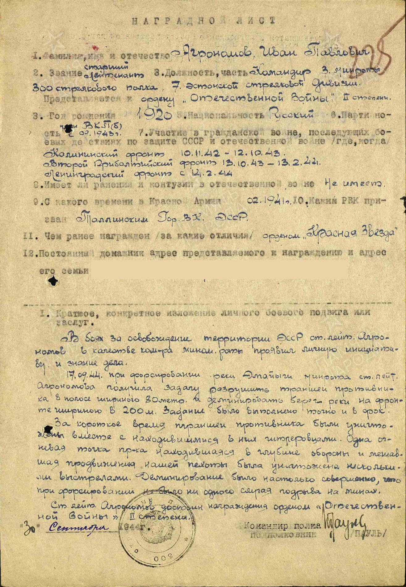 Vanemleitnant Agronomov on autasutatud ka Punatähe ordeniga nr. 843603 Narva jõe lahingute ja veel ühe Isamaasõja II klassi ordeniga nr. 268875 Emajõe forsseerimise eest.