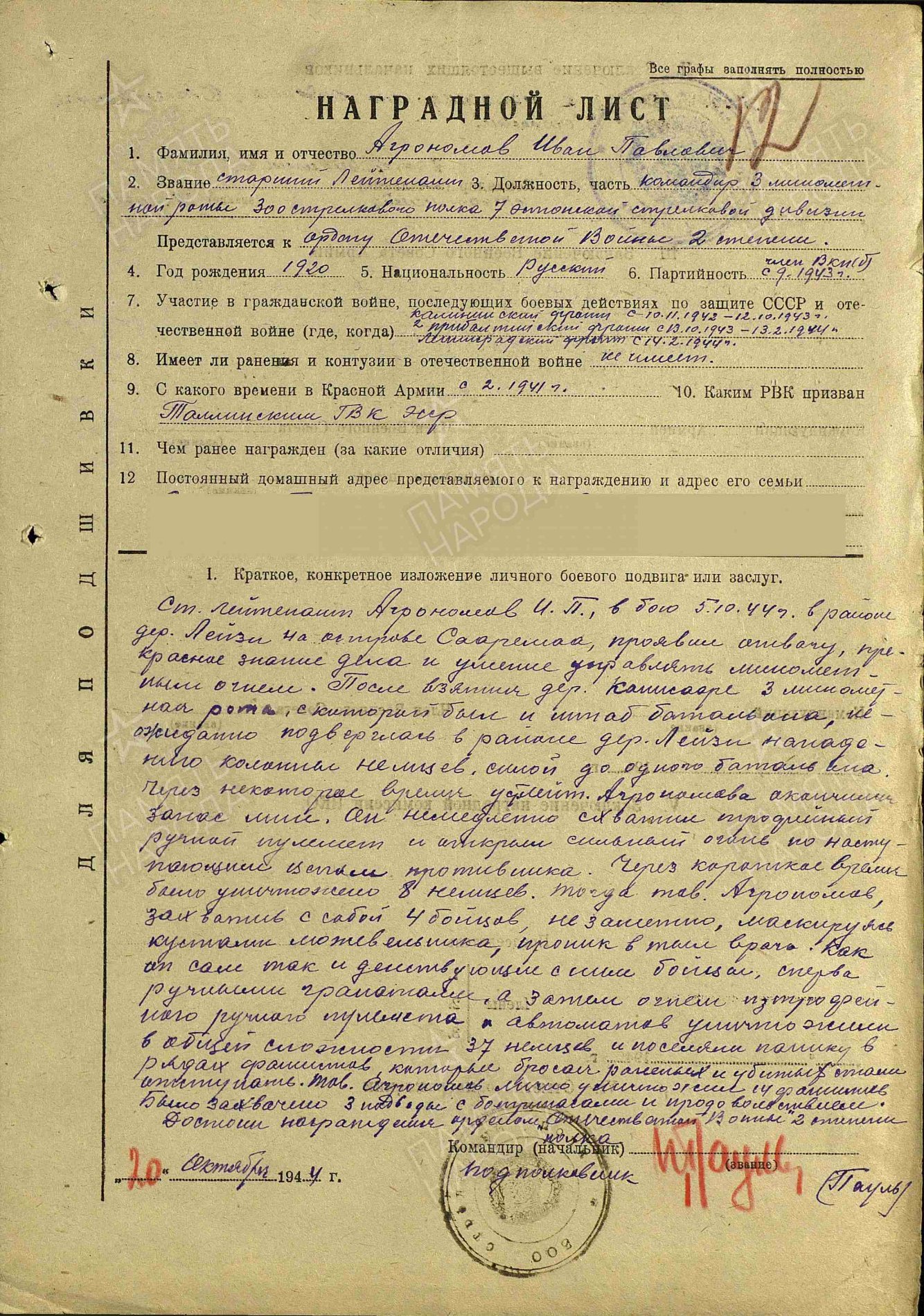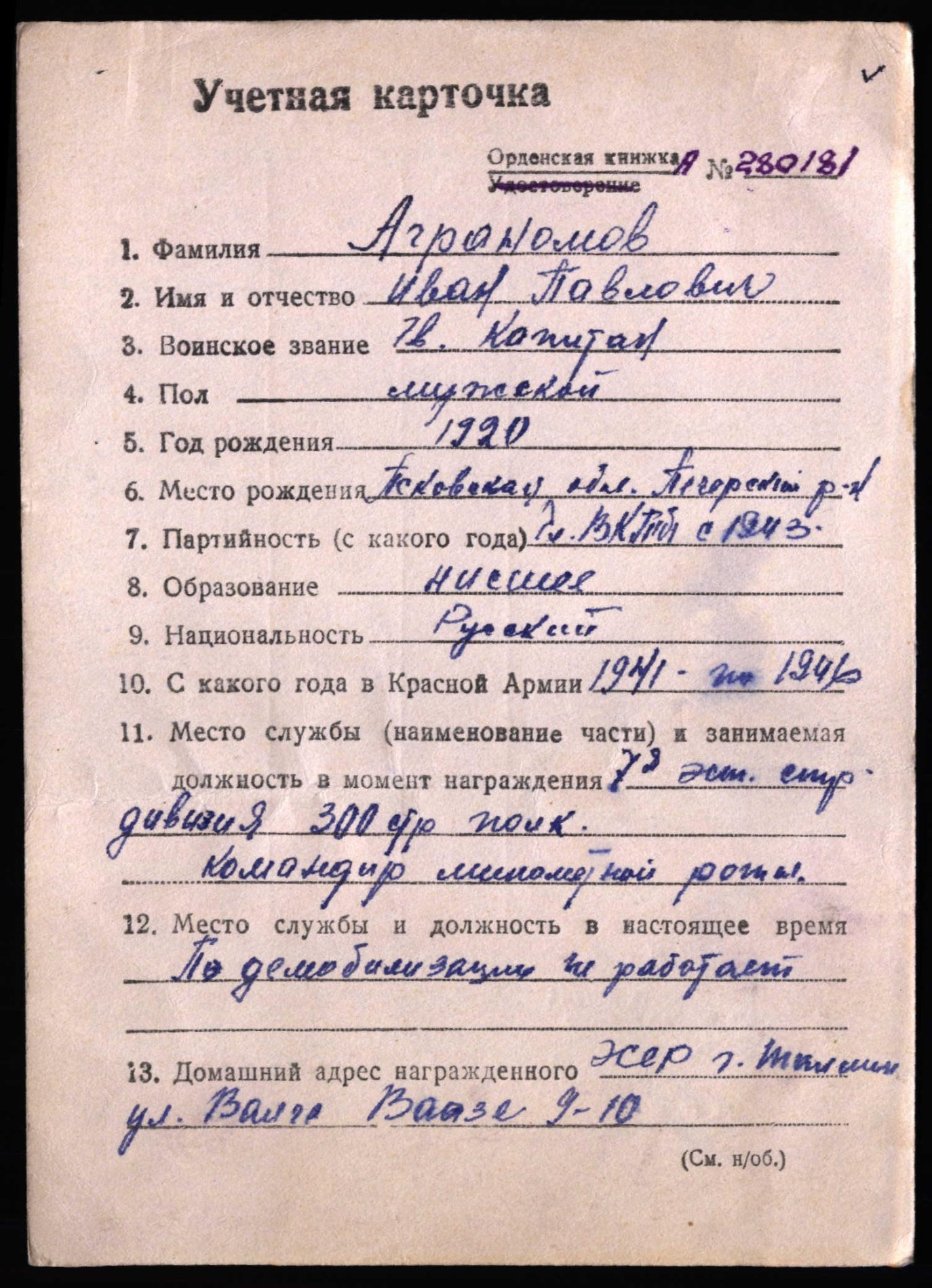 7. laskurdiviisi 300. laskurpolgu 3. miinipildujaroodu komandör vanemleitnant Ivan Agronomov, Isamaasõja ordeni II klassi ordeni nr. 268881 kavaler.