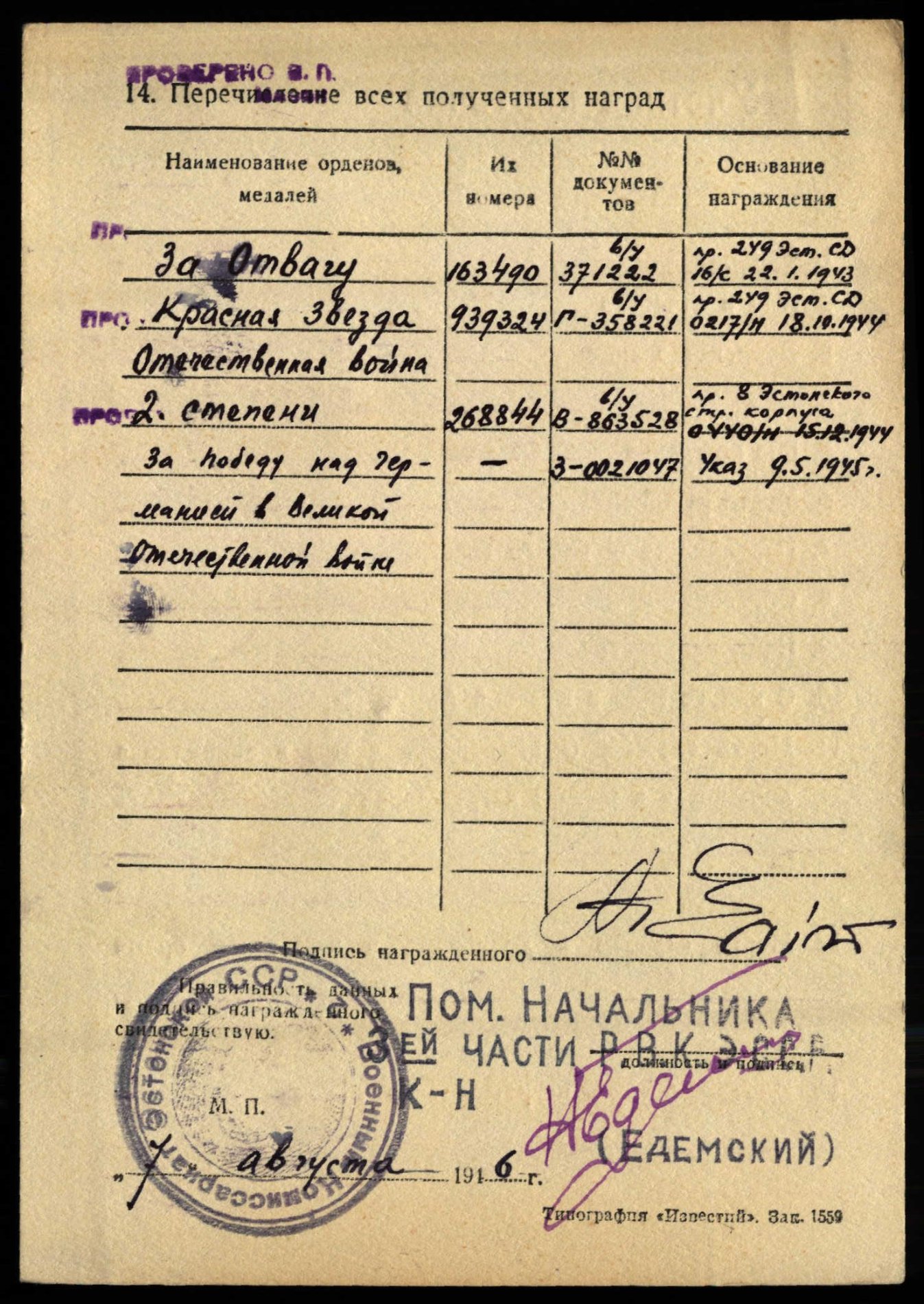 Minnes oma rühma luurajatega rünnakule avastasid nad vaenlase dzoti, mis jäi suurtükiväe tuleulatusest välja ? ja mis segas tugevalt meie väeosade edasiliikumist. Algul roomates ja selle järel kiiresti positsiooni vahetades liikus ta dzoti juurde ning hävitas kogu dzoti garnisoni, millega kindlustas meie väeosade edasiliikumise. Isamaasõja II klassi ordeniga autasustamise vääriline.