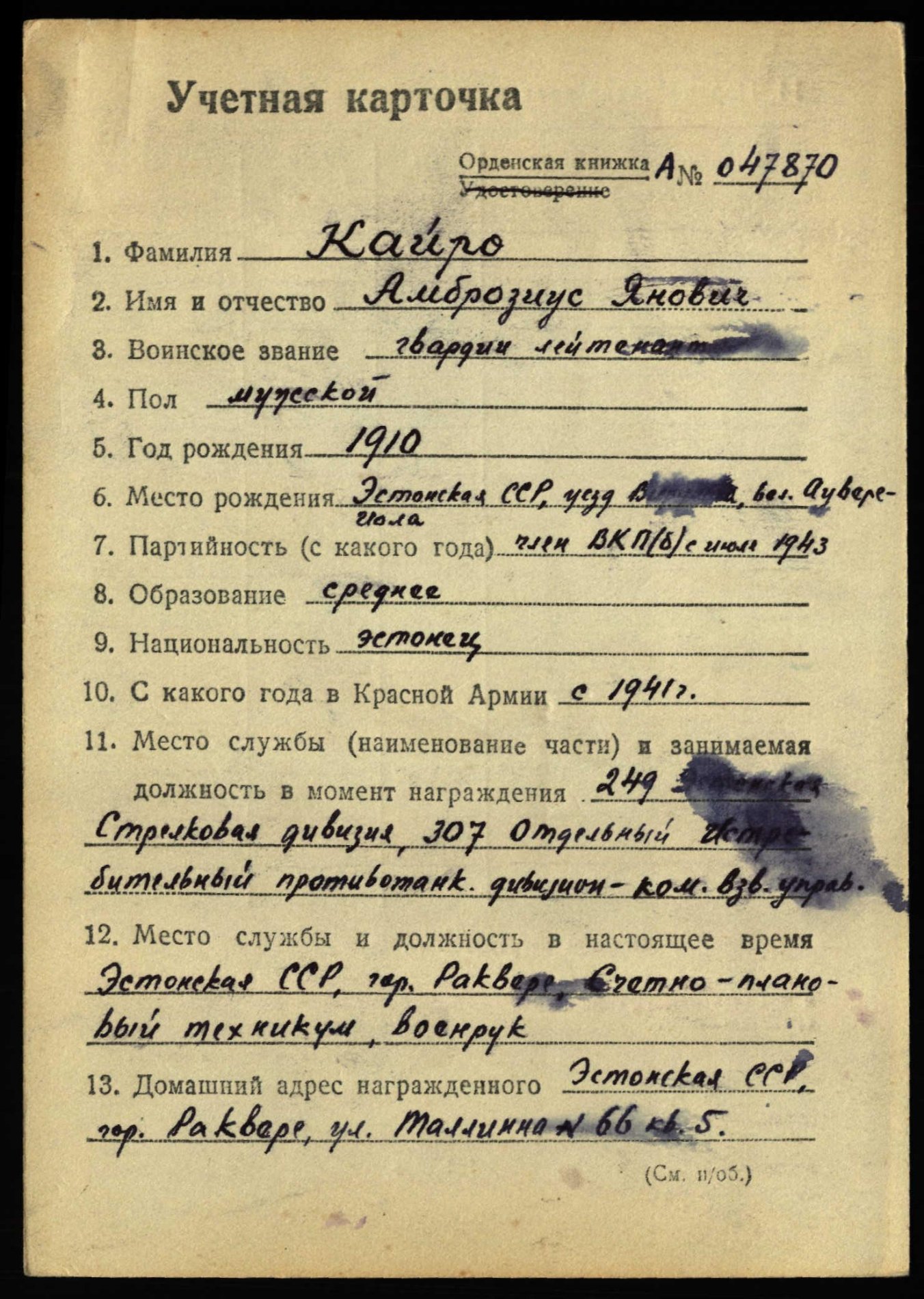 249. laskurdiviisi 307. üksiku tankitõrjedivisjoni rühmakomandör nooremleitnant Ambrosius Kairo, Isamaasõja II klassi ordeni nr. 268844 kavaler.