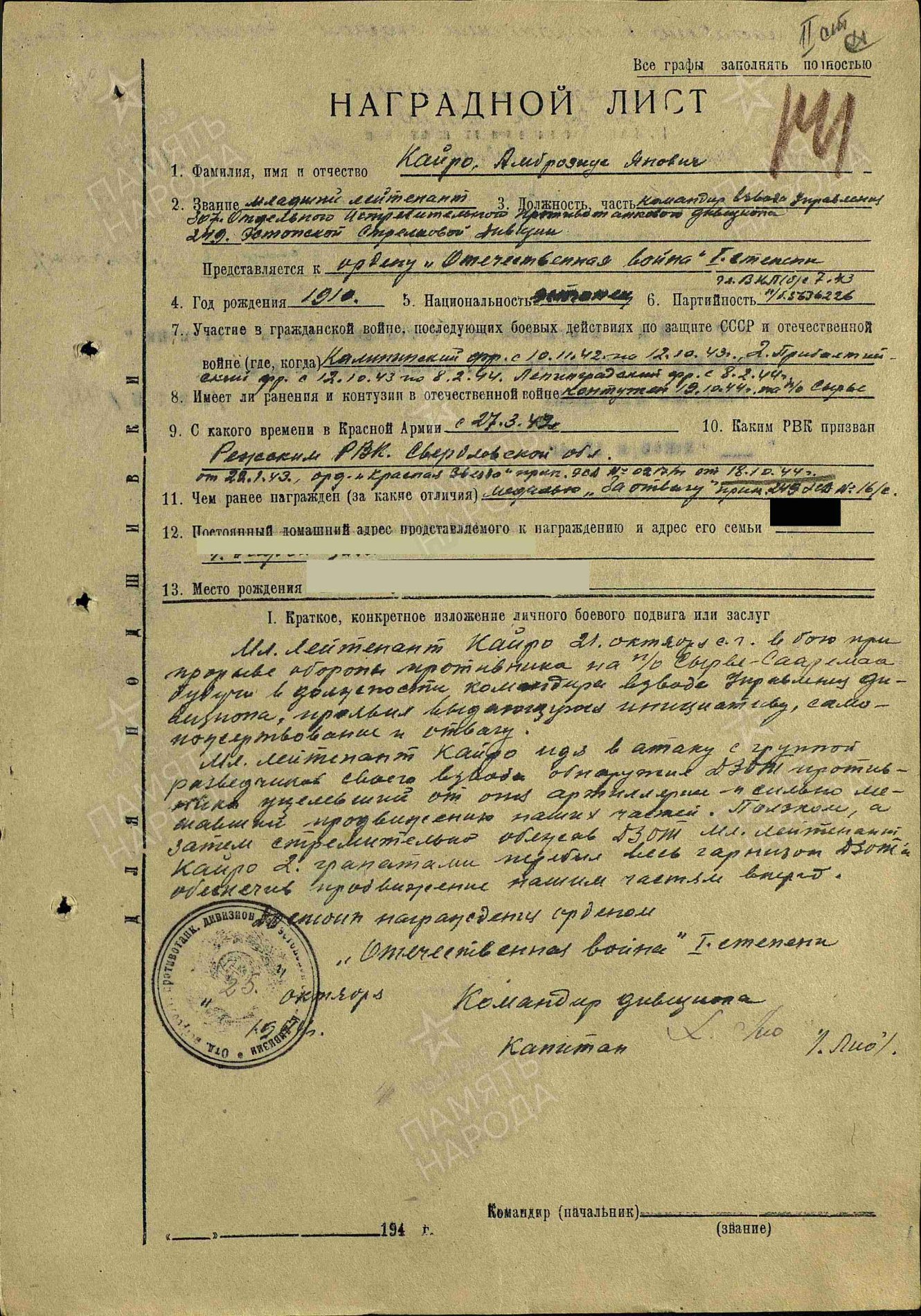 Nooremleitnant Kairo näitas rühmakomandörina 21.10.1944 Sõrve sääre lahingutes vaenlase kaitseliinist läbi tungimisel üles initsiatiivi ja vaprust.