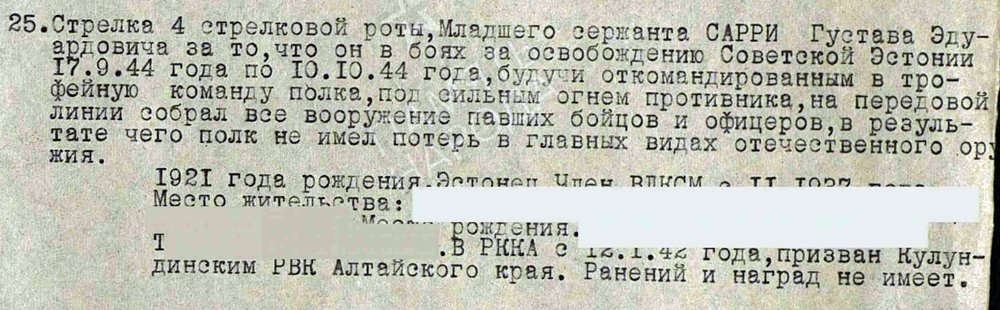 249. laskurdiviisi 925. laskurpolgu laskur nooremleitnant Sarri. Lahinguteenete medali 1826217 kavaler. Sai medali 1944. aasta sügisel selle eest, et komandeerituna trofeeüksusesse korjas eesliinil vaenlase tugeva tule all langenud sõduritelt ja ohvitseridelt relvad ära, mille tõttu polgus ei tekkinud puudust põhilistest relvaliikidest.
