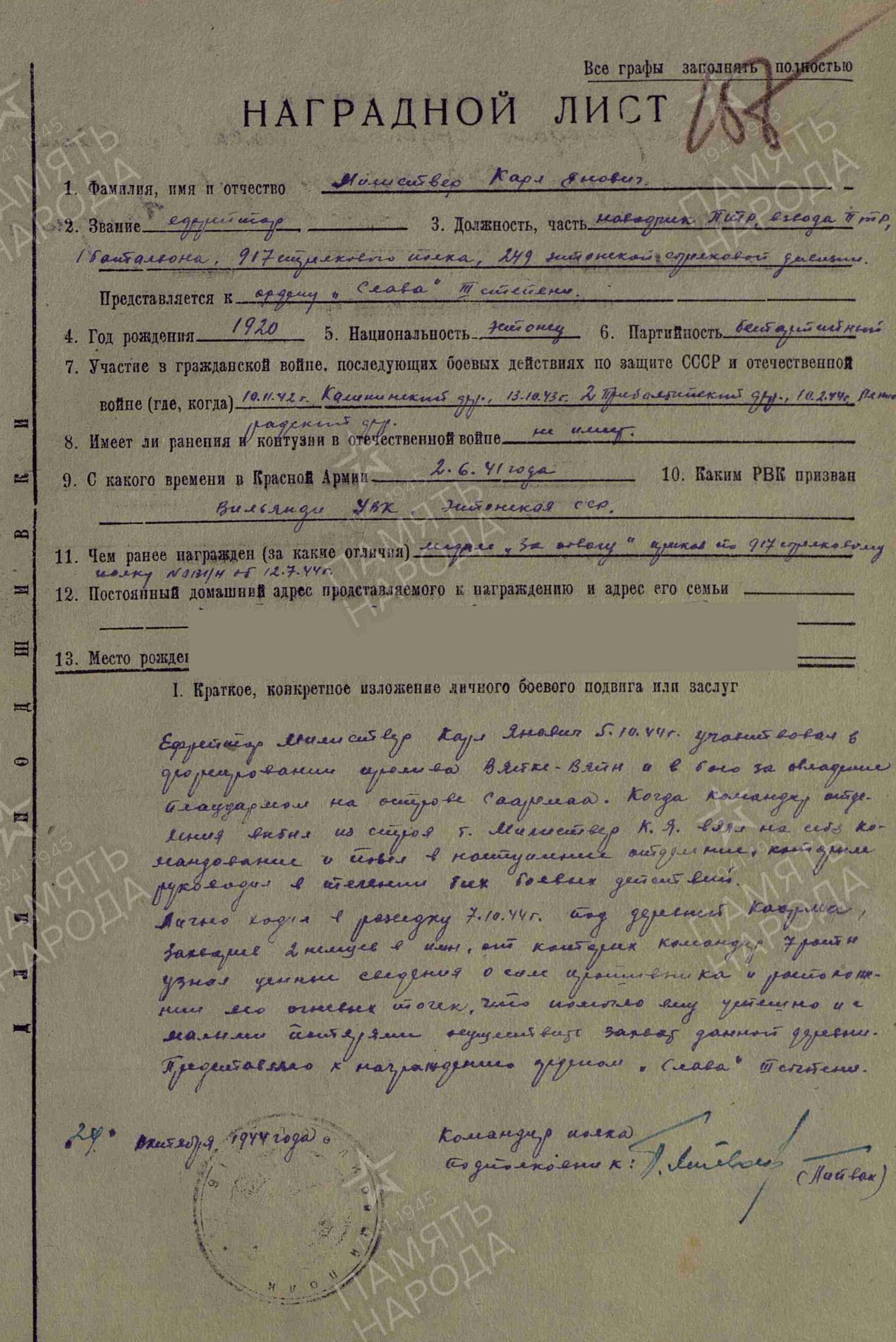 Eesti laskurkorpuse 249. laskurdiviisi 917. laskurpolgu jefreitor Karl Milistver'i Kuulsuse orden (718589) ja Vapruse medal (3356347).