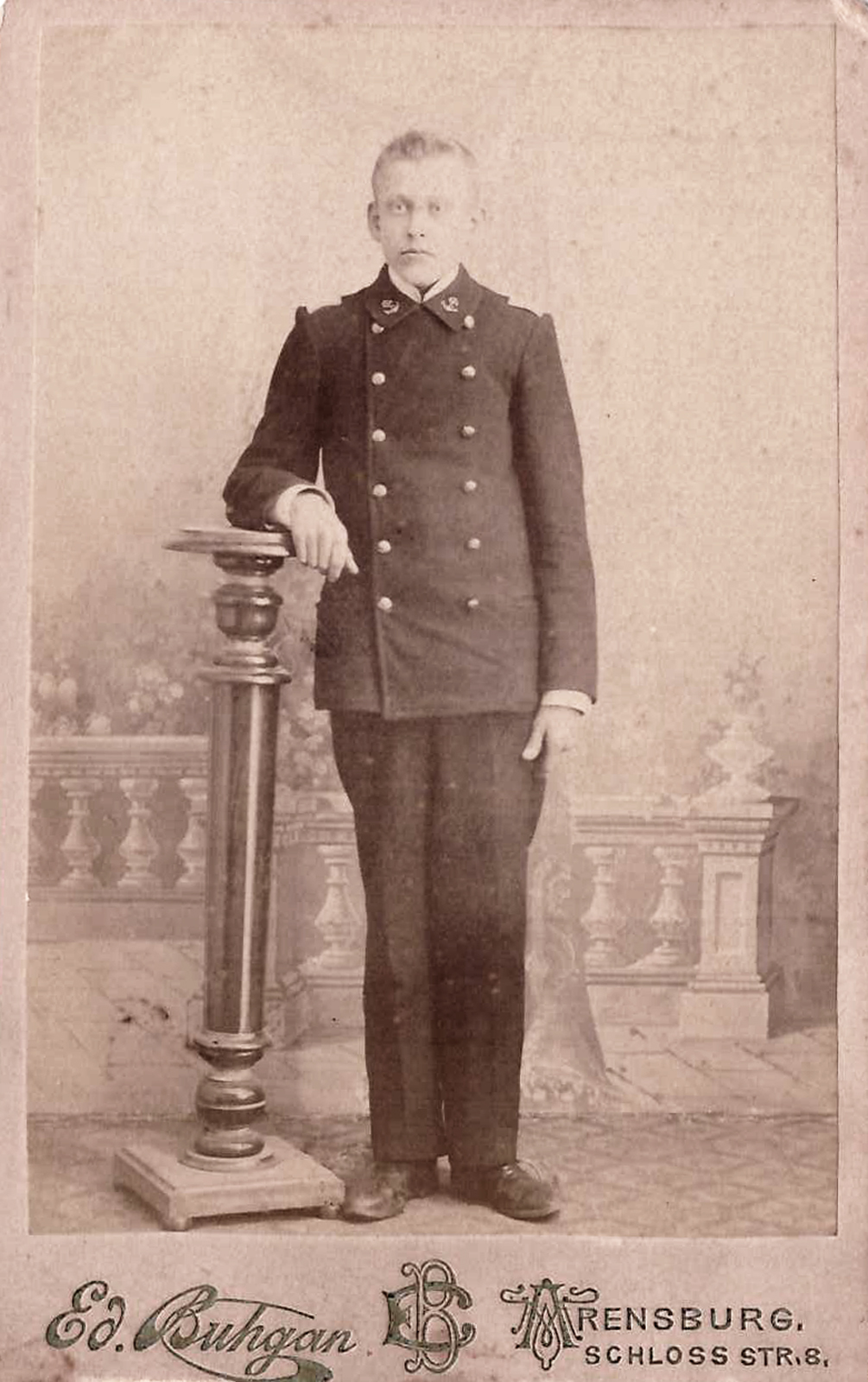 Põhimõtteliselt ei pea merekooli kasvandikuga asja nii keeruliseks ajama. Võib olla ükskõik millise Eestis (foto on vist Eestist) tegutsenud merekooli kasvandik - Pärnu, Narva, Käsmu, Heinaste, Paldiski või Kuressaare oma. Kõik olid 20.sajandi alguseks "kellegi" nimelised juba, peale seda kui koolid kohaliku omavalitsuse (kelleks olid sakslased ja enamasti nende erainitsiatiiv ja ka raha) alt riigi alluvusse viidi.