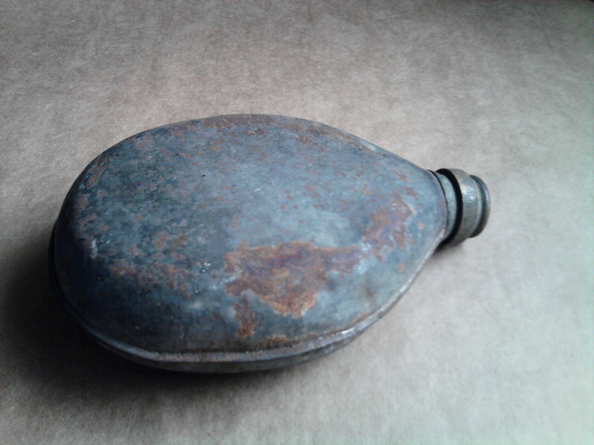 Sai siis hiljuti minu valdusesse selline plasku. Meenutab korpuselt kangesti tsaariarmee Железная фальцованная фляга тип A. Muidu on varasemad tsaariarmee pudelid justnimelt üheltpoolt lapikud ja teiseltpoolt kumerad, olgu raudplekk või alumiin. Model 1909 alumiinpudelid läksid läätseks, ehk mõlemalt poolt kumeraks alles. Ja kuju servavalts фальцованная mudeliga klapiks kui ka pinnatöötlus, kui ei tekiks suurt aga - tavalisel pudelil käis tavaline punn peale nagu igal teisel, siin aga peal keermega messingkork. Samas mõtisklesin, et tsaaripudelitel oli eri tootjaid ja esines nt kujuerinevusi pudelitel, küll mitte tohutuid erinevusi, aga siiski kujus tajub vahet. Sealt edasi hakkasin mõtlema, äkki esines siis ka punnides, aga et nii kardinaalne erinevus, see tundub jälle kuidagi ebaloogiline. Internetiavarused ei ole ka mind suutnud targemaks teha. Samkompunn ka ei tundu olema, kuidagi väga korralikult on tehtud. Korgi peal paistab olevat midagi olnud, tundub, et tinaga on hiljem parandatud/joodetud midagi seal, korgi sees korgipuidust tihend.
