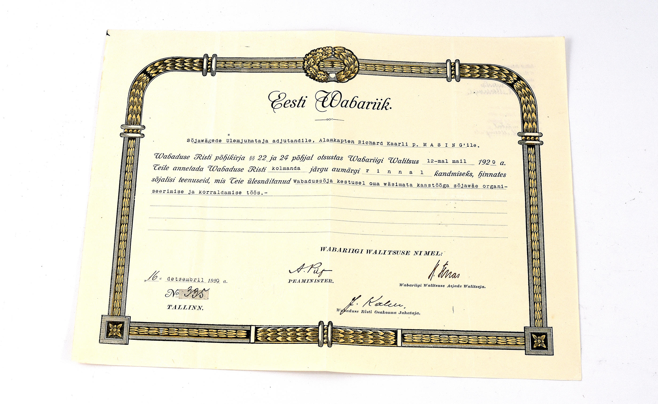 Mõned tunnid tagasi müüdi ühes Rootsi oksjonimajas Eesti koloneli Richard Maasingu komplekt, mis koosnes tema autasudest ning nende dokumentidest ja Soome armee vormikuuest. Kopeerin osa oksjonimaja pilte ka siia foorumisse - ehk on siin mõni keda huvitab.
