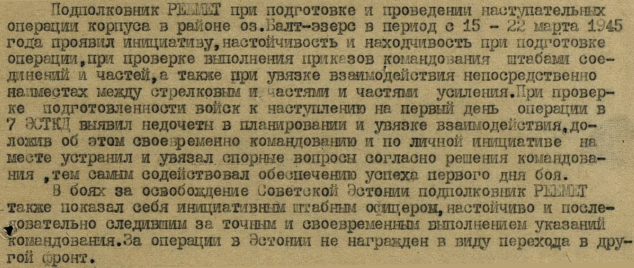 8. Eesti laskurkorpuse operatiivstaabi alampolkovnik Oskar Reemet'ile annetati 2. järgu Isamaasõja orden (496760) Kuramaa lahingute eest.