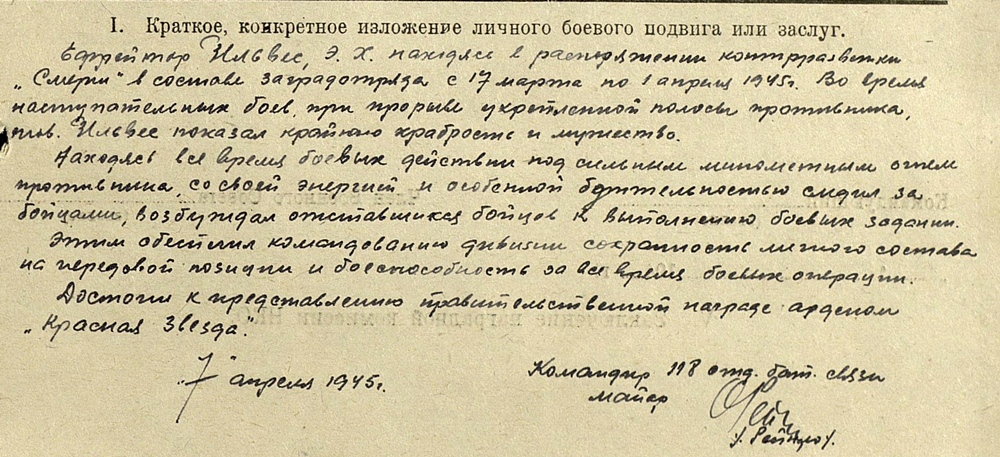 "Za otvagu" nr 2 764... ja "Za bojevõje zaslugi" on numbrita. "Võit Saksamaa üle" medali dokument on allkirjastatud polgukomandör Ilmar Pauli poolt.