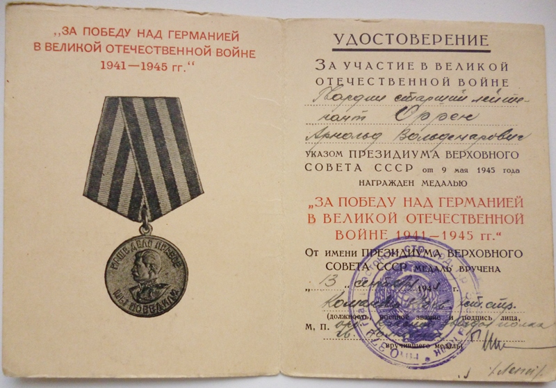 249. Laskurdiviisi 925. Laskurpolgu 2. kuulipildujate roodu jaokomandör Arnold Orren. Ilma numbrita Lahinguteenete medal on saadud Punaarmees väljateenitud aastate eest. Punatäht saadud Kuramaal Ereni küla juures, Isamaasõja II klassi orden aga Septembris 1944. Udeküla ( kui nüüd õieti välja loen, selline koht on Tamsalu kandis ) juures, kus jäi oma jaoga vaenlase piiramisrõngasse. Avas isiklikult vaenlase pihta tule kuulipildujast, mille meeskond oli rivist välja löödud. Sai küll rinda haavata, kuid ei lahkunud kuulipilduja juurest ennem, kuni lõppes laskemoon. Selle tulevahetuse tulemusena sai rood vaenlase piiramisrõngast välja murda.