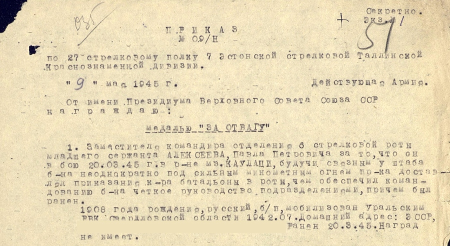 Nüüd aga kaks Vapruse medalitega autasustamist Paul Alekseejev ja Elmar Luht. Mõlemad 1945. aasta Märtsikuu Kuramaa lahingute eest. Luht-i medalit hetkel veel otsitakse, Alekseevi medal on sellises seisus, et seda pole vist kunagi kantudki. Medalite seerianumbrid on ka üsna ühte auku.