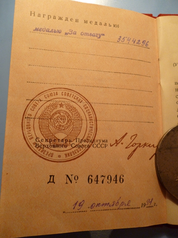 Teine vapruse medal 2402785 saadud vastuluureüksuse SMERSH käsutuses karistusüksuses olles ( ilmselt Kuramaal ), kus peeti erilist hoolt selle üle, et kõik kes peaks on ikka eesliinil ja täidavad oma lahinguülesandeid. Lühidalt siis midagi sellist. Tegelikult esitati ta viimase eest Punatähe ordenile, aga sai Vapruse medali.