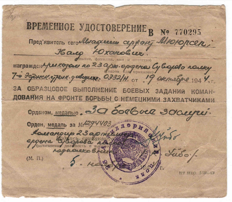 Selline medali dokument on tegelikult küllaltki haruldane, sest see on ajutine medali dokument. Just selline dokument anti Sulle rindel koos medaliga pihku. Sõja lõppedes läksid selle dokumendiga sõjakomissariaati, kus Sulle siis punasekaaneline ordeni või medali tunnistus välja kirjutati ja ajutine tunnistus ära võeti.