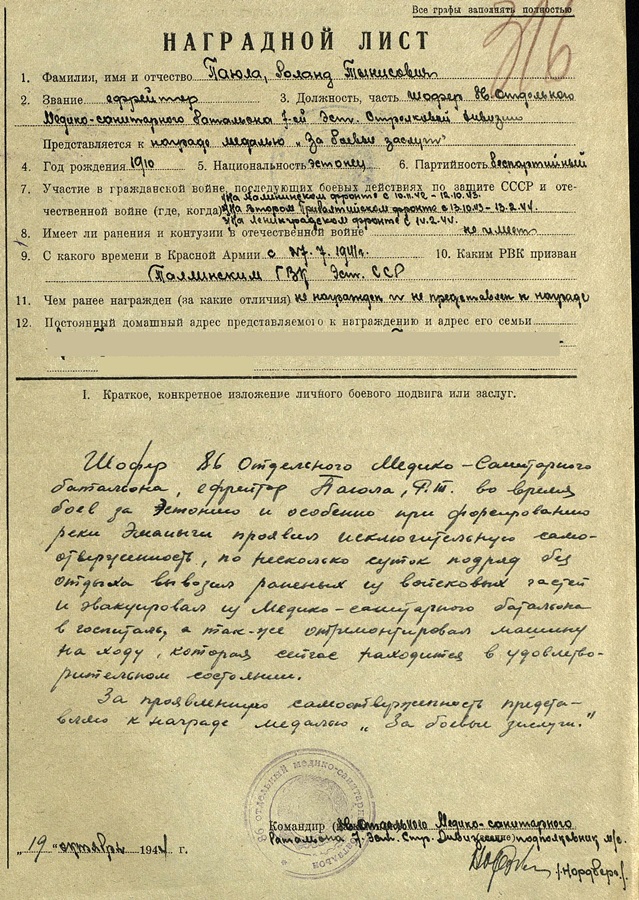 Väidetavalt esitati ta Saaremaa lahingute eest Nõukogude Liidu kangelase kandidaadiks, kuid jäi sellest aunimetusest ilma, kuna ei astunud partei liikmeks. Saaremaal võitles ta 300. laskurpolgu kooseisus 5. laskurroodu luurajana. Mees ise vasakult teine.