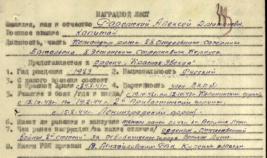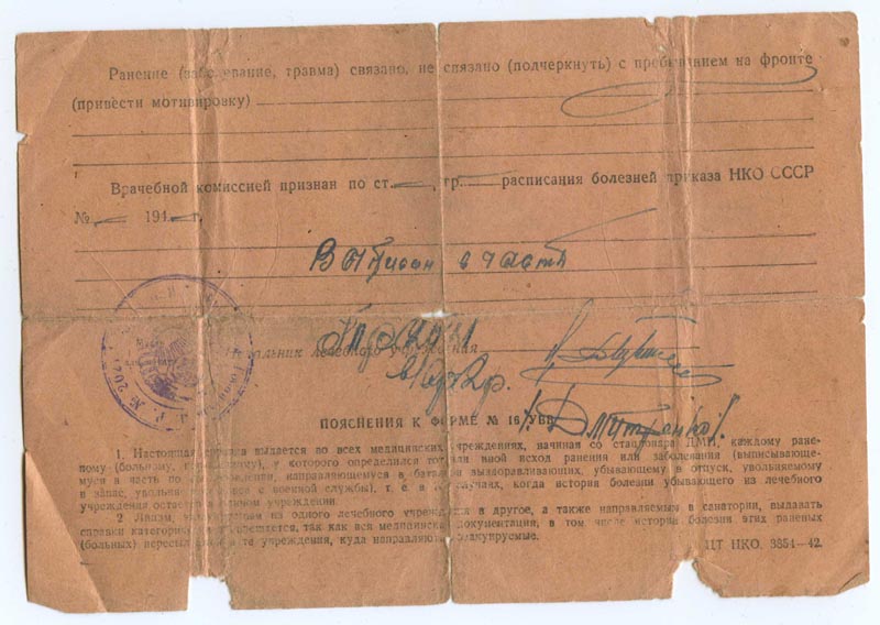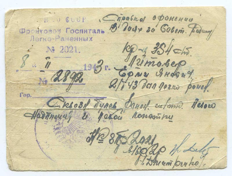 Haavata sai Velikije Luki all, mille kohta on olemas ka dokumendid ja haavatulint, mis õmmeldi vasaku rinnatasku kohale (näha viimasel pildil).