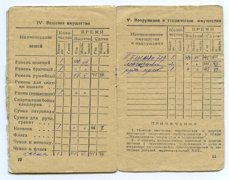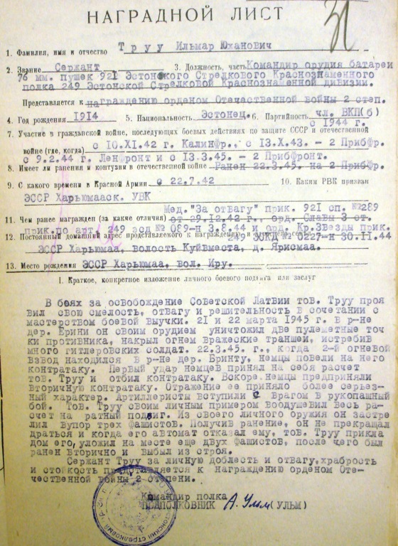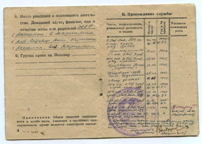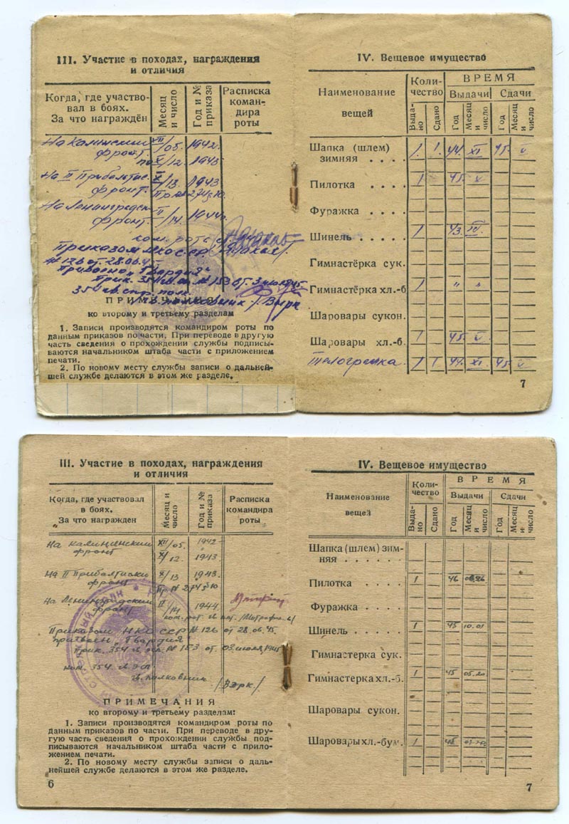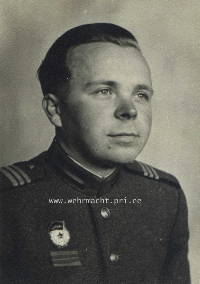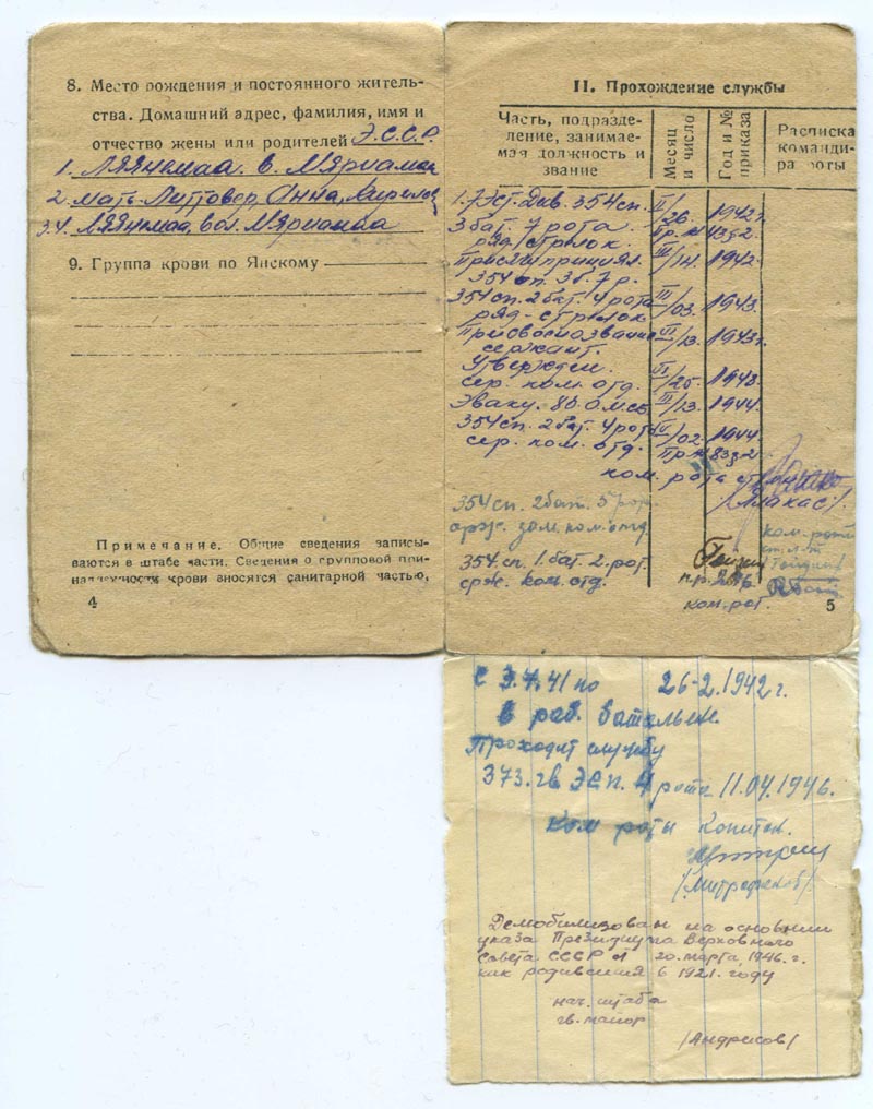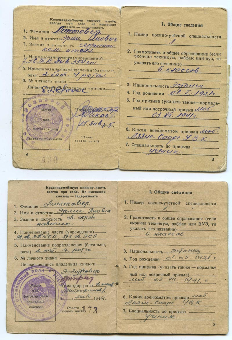 Punaarmeelase raamatute pildil vasakpoolne on väljastatud 1945. aasta jaanuaris ja parempoolne 1946. aasta mais, 1945. aastal väljastatud raamatus on kirjas, et ta oli relvastatud PPSh püstolkuulipildujaga. Mõlemad lisatud fotod on pildistatud 1946. aastal, teisel fotol poseerib ta enda poolt kujundatud ja teostatud "pataljoni lahingutee" nurgakese ees (peos näha veel pintslid ja värvipotsik). Lõpus on tema demobiliseerimistunnistus ja aumärgid.