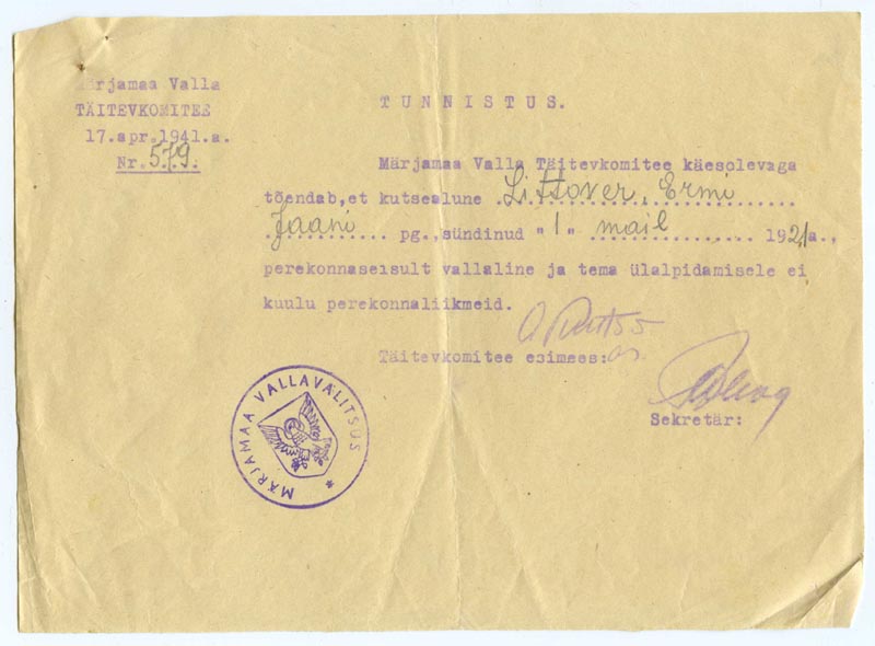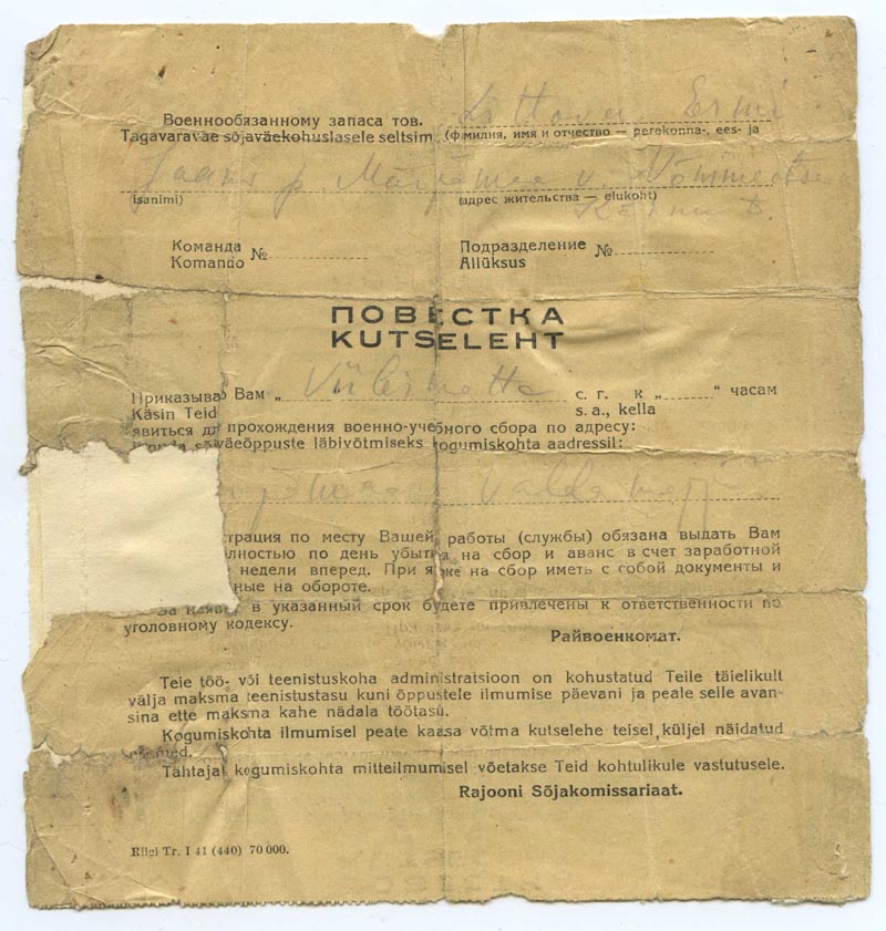 Teine dokument, mis siin näha on toodi talle 1941. aasta jaanilaupäeval ja kohustas teda ilmuma kogumiskohta - ehk siis teisisõnu mobiliseerimiskäsk.