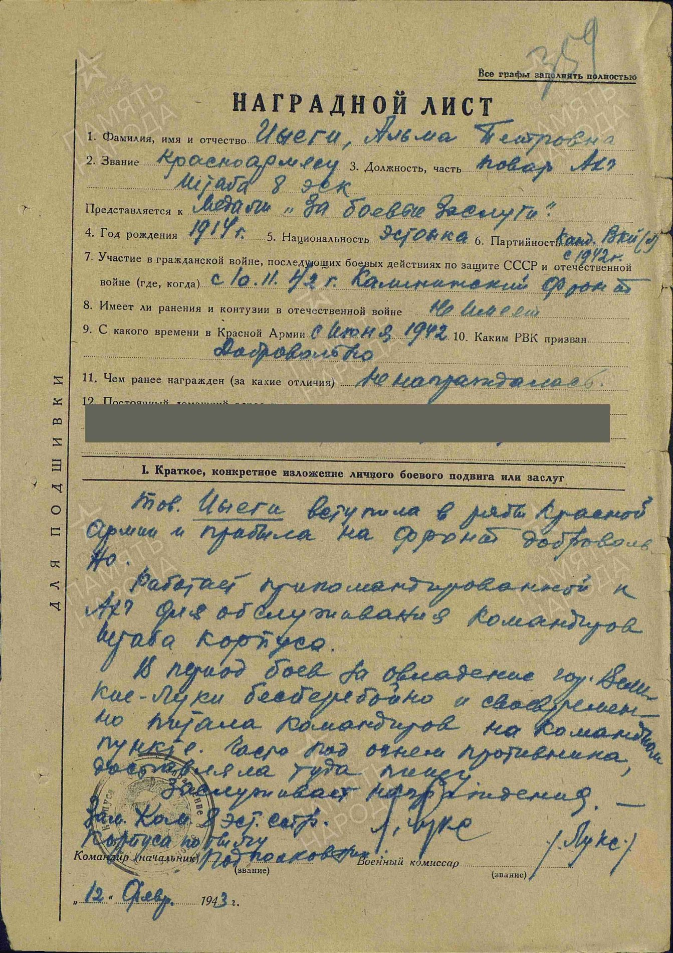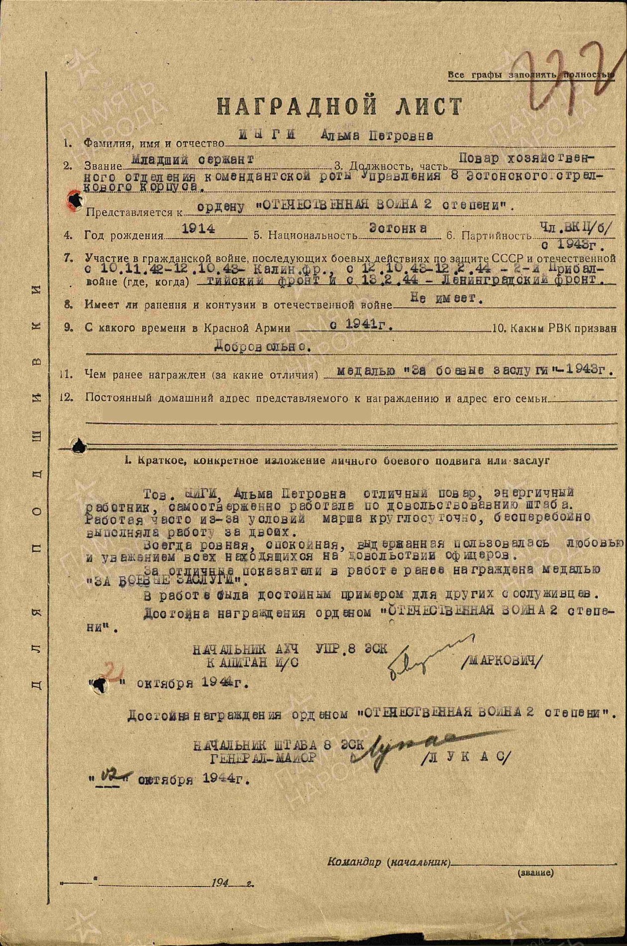 Nooremseersant Alma Jõgi. 8. Eesti Laskurkorpuse staabi kokk. Lahinguteenete medali 181868 ja Isamaasõja II klassi ordeni nr. 125513 kavaler.
