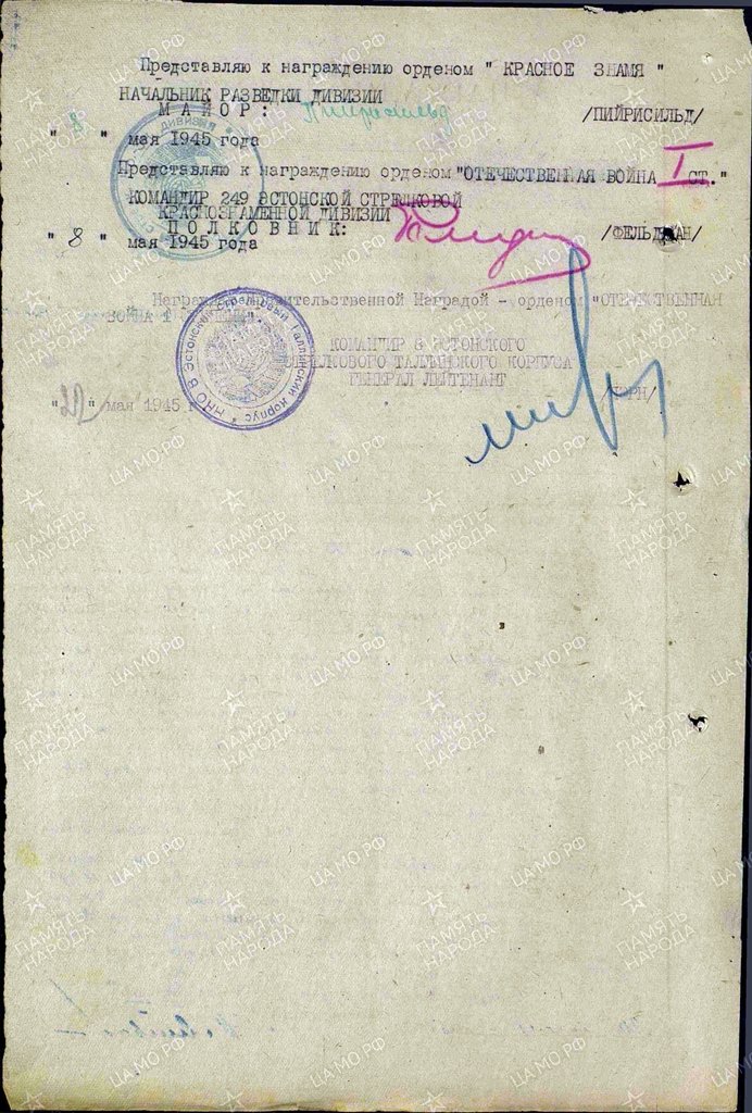 Sama käskkirjaga said Isamasõja ordeni veel kaks meest: 249. Laskurdiviisi 925. laskurpolgu voorimees, jefreitor Arnold Urbla ja 249. Laskurdiviisi 779. suurtükiväepolgu patareikomandör, vanemleitnant Konstantin Pihlamägi.