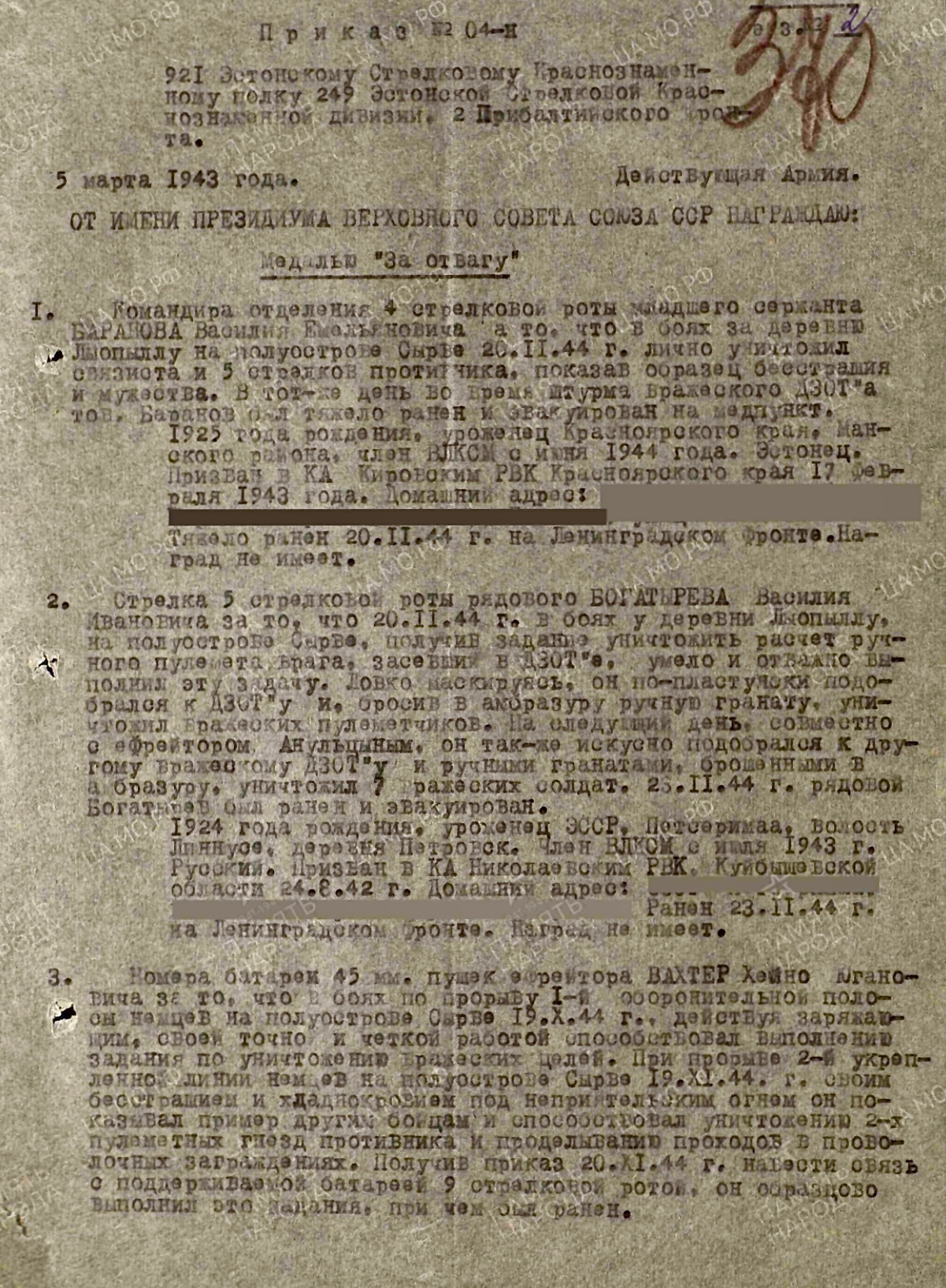 Otsin medalit „за Отвагу“ ühele Eesti Laskurkorpuse võitlejale, Tanner Johannes.