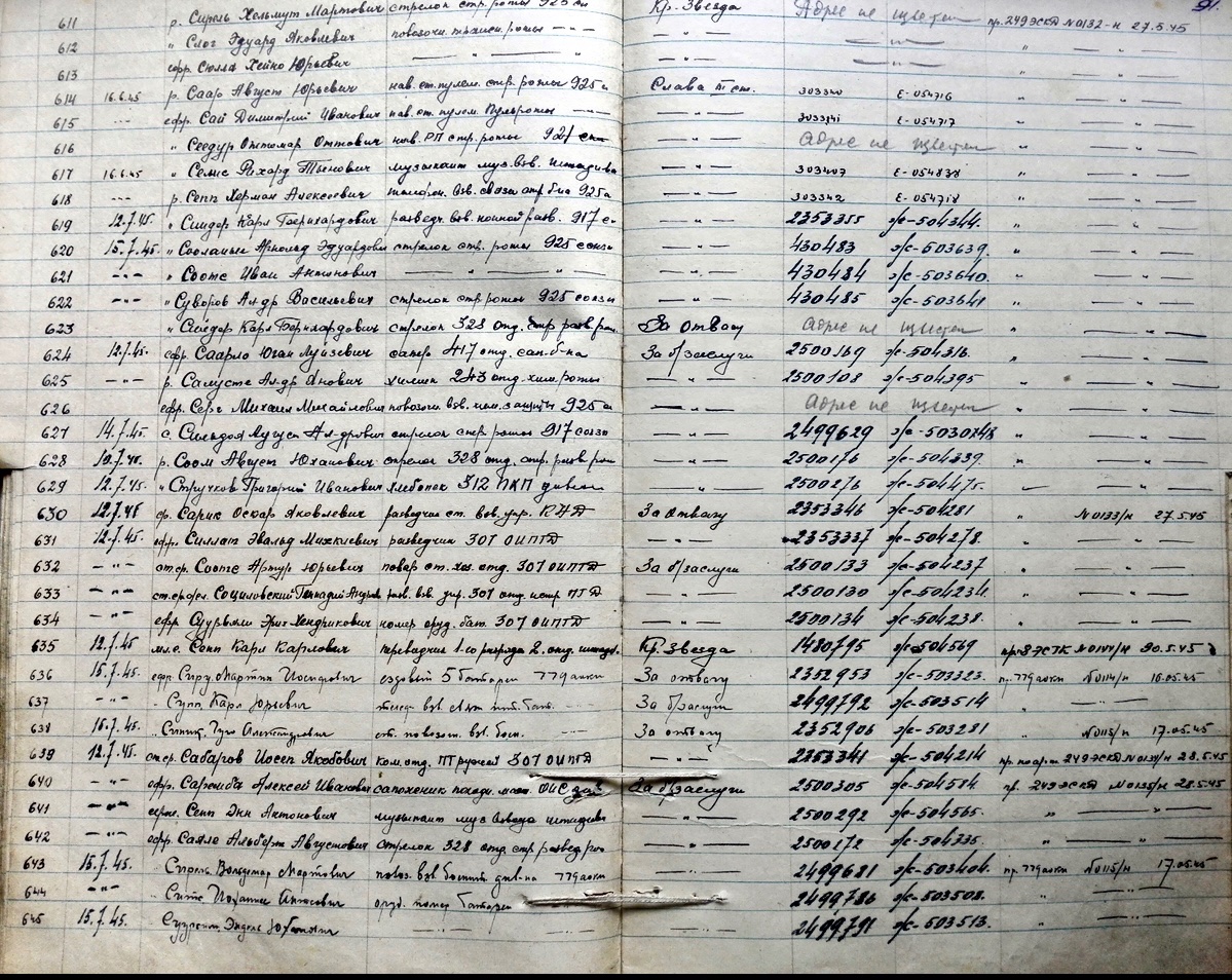 Nüüd on omanik ka teada. Orden annetati 29.09.1944 8. ELK'i 7. laskurdiviisi poliitosakonna agitaatorile major Viktor Kosenkranius'ele selle eest et: "Lahinguteks valmistumise ajal ja lahingutevahelistel pausidel töötas agitaatorina. Enne üksustesse väljasõitu pidas ta isikkoosseisu ees loenguid ja vestlusi, millega mobiliseeris neid lahinguülesannete eeskujulikule täitmisele.".Veiler kirjutas: ↑E Okt 06, 2025 5:07 pm Täna sain sellise kenas säilivuses Punatähe ordeni (939380). Autasu tuli ilma omaniku infota aga sellest 939 vahemikust on praeguseks teada juba päris omajagu 8. Eesti laskurkorpuse mehi. On säilinud ja siin teemas näidatud ka sellest minu tänasest ordenist järgmise numbriga autasu ja see annetati 1944. aasta juulis kapten Paul Värk'ile.