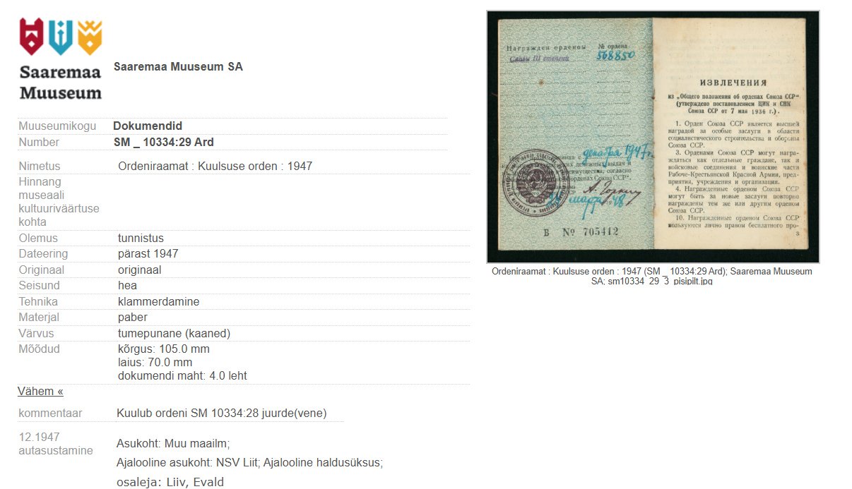 Ei saagi päris täpselt aru, et mis selle ordeniga juhtunud on. Oleks nagu riivamisi pihta saanud ja ’’Võidu eest Saksamaa üle’’ medal ning tunnistus on talle ka garnisoni sõjaväehospidali poolt antud. Et kas sai siis millaski ennem seda näiteks ordenit kandes haavata... ei tea.