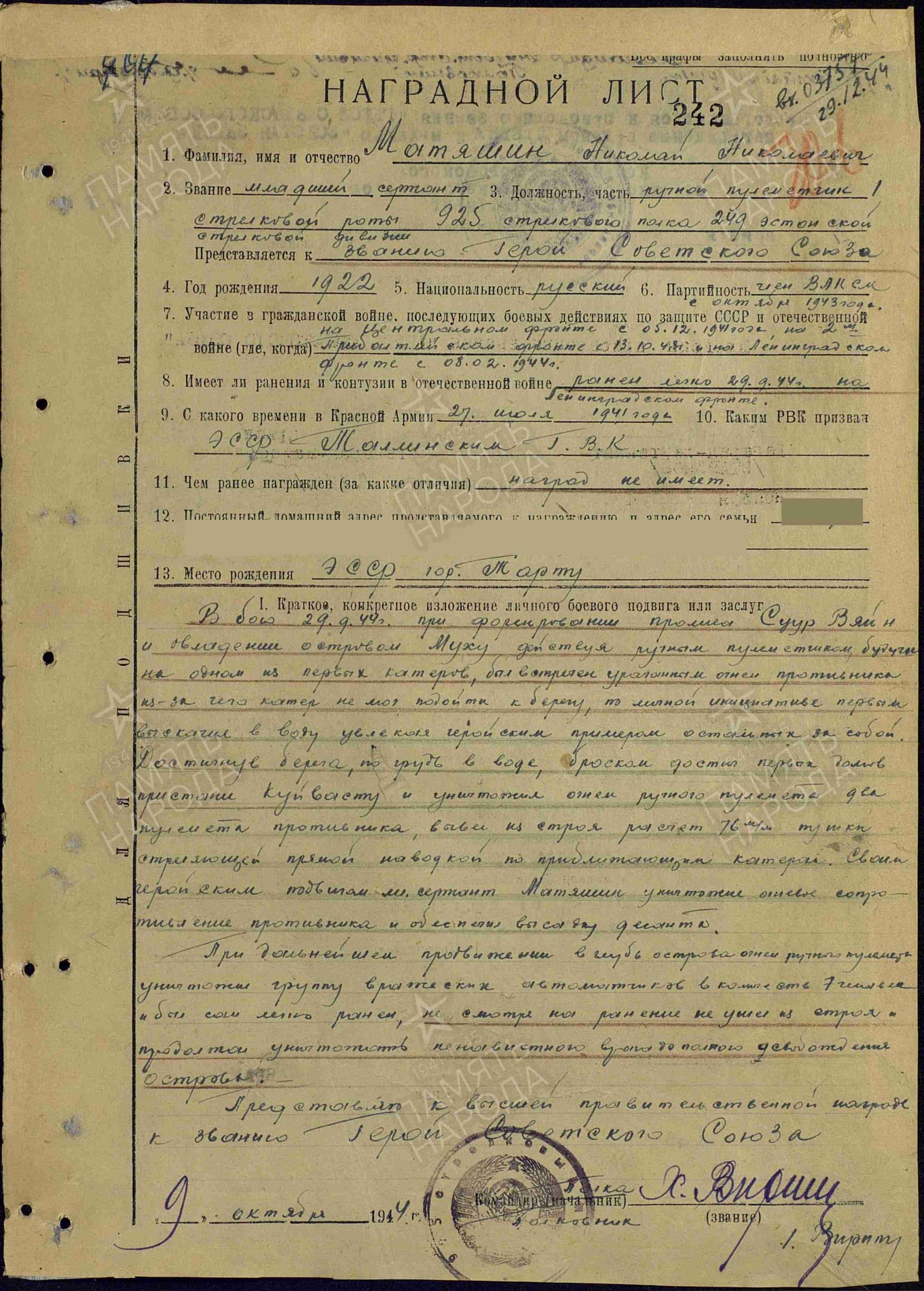 1942. a detsembris autasustatud Punatähe ordeniga, autasulehelt: