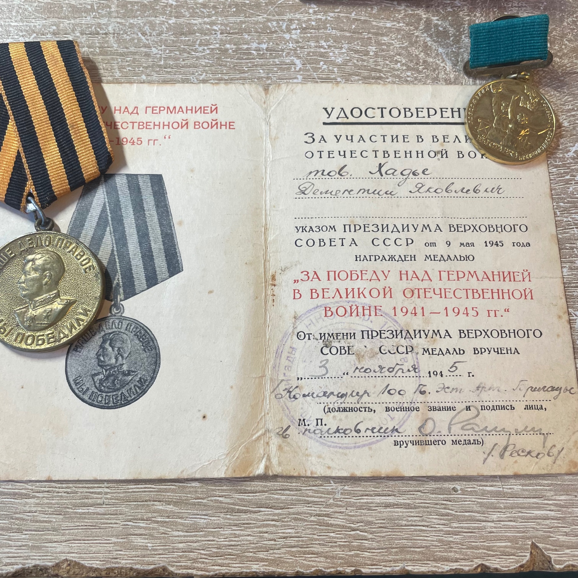 Dementi Hadje/Hade. Eesti laskurdiviis, 23. Suurtükiväepolk. Vapruse medali(2764557) ja Kuulsuse ordeni III klassi(303486) kavaler. Kahjuks alles vaid ordeniraamat ja muud nodi, medalid jalutama läinud, kuid pole võimatu, et tulevikus välja ilmuvad.