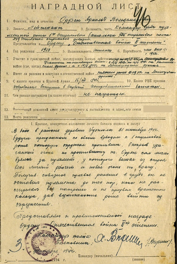 249. Laskurdiviisi 925. Laskurpolgu 2. kuulipildujate roodu jaokomandör Arnold Orren. Ilma numbrita Lahinguteenete medal on saadud Punaarmees väljateenitud aastate eest. Punatäht saadud Kuramaal Ereni küla juures, Isamaasõja II klassi orden aga Septembris 1944. Udeküla ( kui nüüd õieti välja loen, selline koht on Tamsalu kandis ) juures, kus jäi oma jaoga vaenlase piiramisrõngasse. Avas isiklikult vaenlase pihta tule kuulipildujast, mille meeskond oli rivist välja löödud. Sai küll rinda haavata, kuid ei lahkunud kuulipilduja juurest ennem, kuni lõppes laskemoon. Selle tulevahetuse tulemusena sai rood vaenlase piiramisrõngast välja murda.