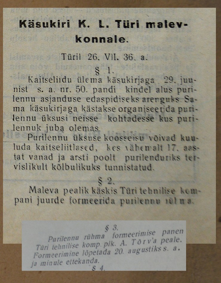 Kaitseliidu ülem kindral J. Orasma a on teinud korralduse malewaile leunutegewusest tagasi tõmbuda. Uute purilennukite ehitamist kaitseliit enam ci alusta, samuti ka teisi algatusi, mis kuludega seotud. Seniste pooleliolewate lennukite ehitus wiiakse lõpule ja lennukeid kasutatakse mabade summade piirides. Kaitseliidu ülema otsus on tingitud as° jaolust, et ei ole ette näha korrapäraseid krediite leunuala edasiwiimiseks. On ju lendamine paratamatult kuludega seotud. Samuti puudub kindel üldine korraldus eralennu alal.