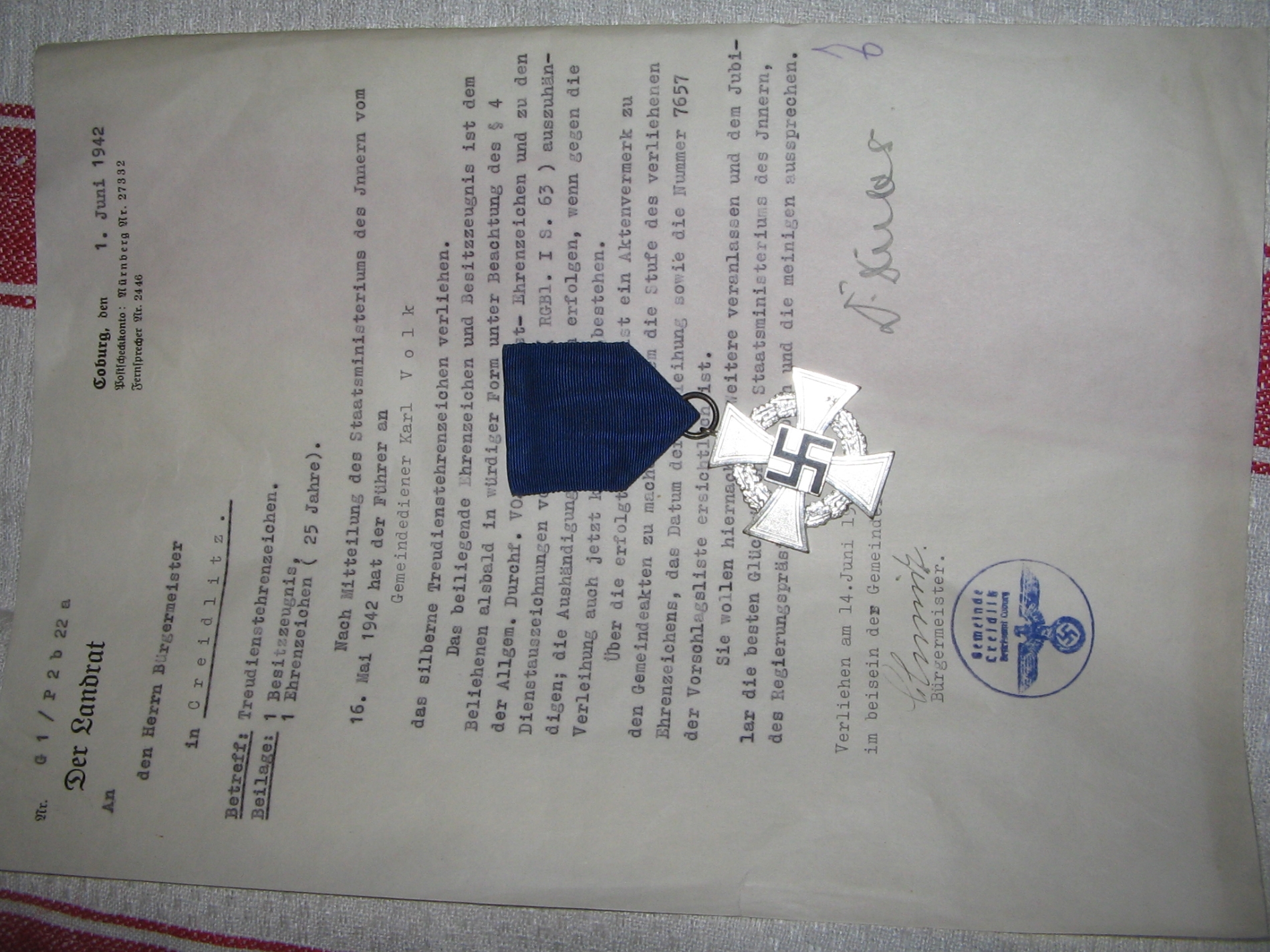 25 aastat truud teenistust. Iseenesest laialt levinud aumärk, sel eksemplaril on aga säilinud ka tunnistus.