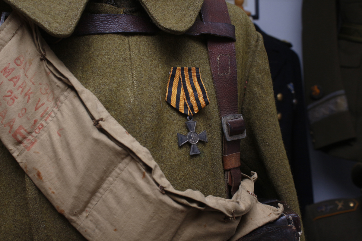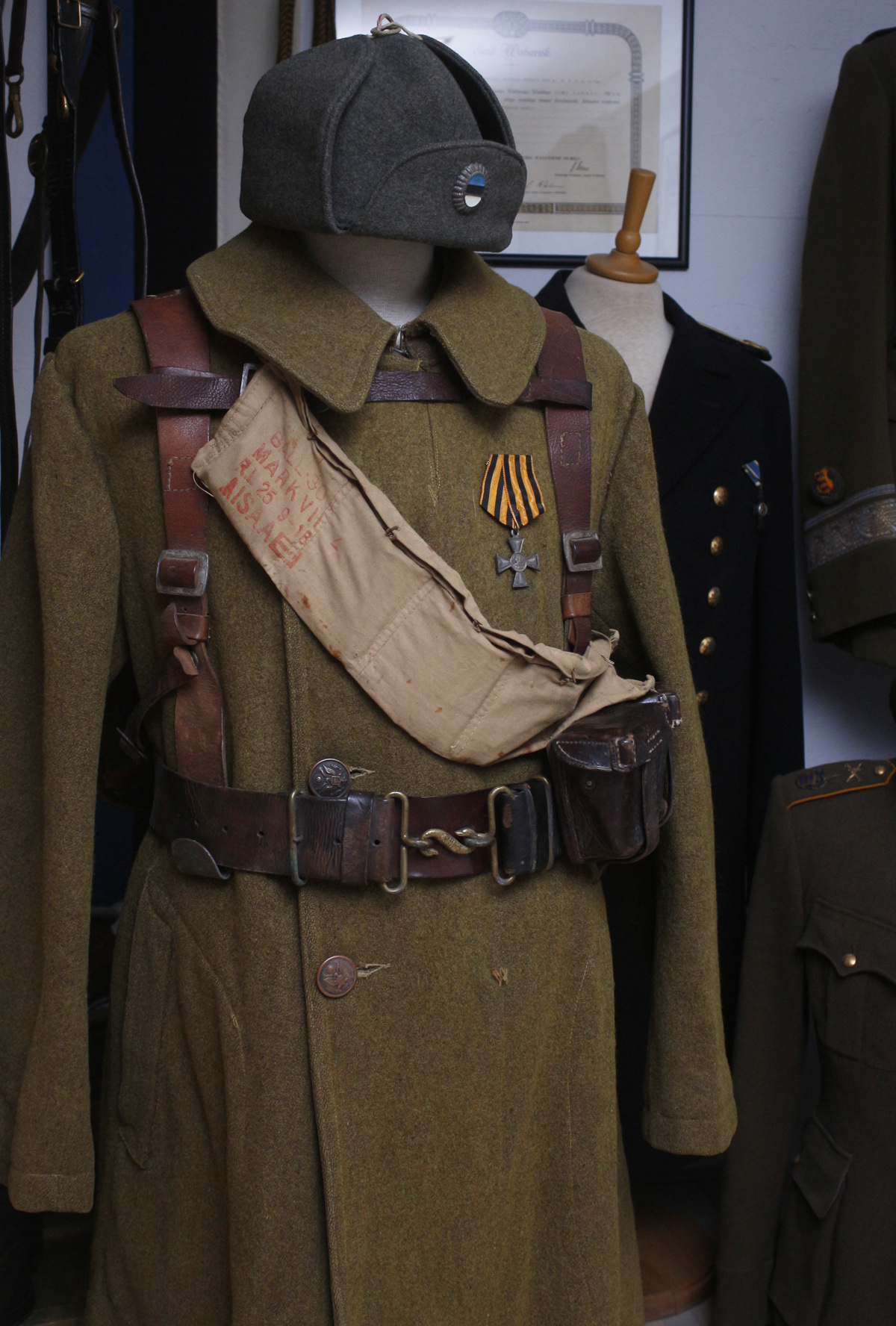 USA sõjaväe sinel, Suurbritannia päritolu vöörihm ja padrunivöö ning Esimese maailmasõja aegne tsaariarmee suurtükiväelase / sapööri ranits annavad kokku Eesti sõduri meie Vabadussõjas. Kõik esemed on kodumaised leiud. Seljakoti ja vöörihma omanik oli Esimeses maailmasõjas suurtükiväelasena teeninud Läänemaa mees Toomas Helsingfors.