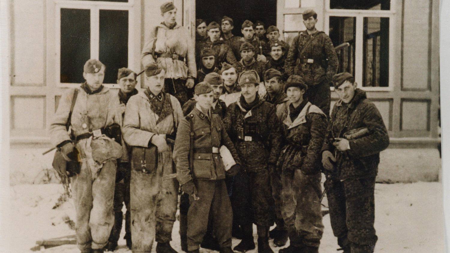 Group of battle-hardened norwegian soldiers in front of the casino in Hungerburg. Near Narva on February 1944 ...