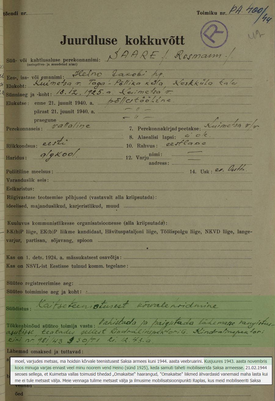 Veel mõned infokillud Leo ja Heino kohta. Tuleb välja, et Leo rääkis 1946. aasta 18. märtsi ülekuulamisel kõik ausalt ära, sest faktid, mis arhiivist on õnnestunud leida, kattuvad ülekuulamisel antud andmetega (kuupäevad ja kohad). Ta salgas maha ainult üksuse, millesse oli kuulunud. Tema jutu järgi oli selleks karistuskompanii, kuhu teda ja tema venda suunati kui sõjaväest kõrvalehoidjaid. Nüüd võib öelda, et üksused, millest ta koos vennaga läbi käis, olid - 33. SS tagavara- ja väljaõppepataljoni 12. kompanii > 20. SS tagavararügemendi 9. kompanii > 20. SS välitäienduspataljon > 20. SS diviisi 47. SS rügemendi I pataljon.