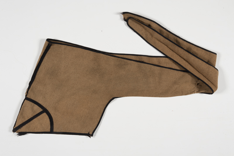 õmmeldud villasest kodukootud? pruunist kangast, kaunistatud musta pealeõmmeldud puuvillase paelaga