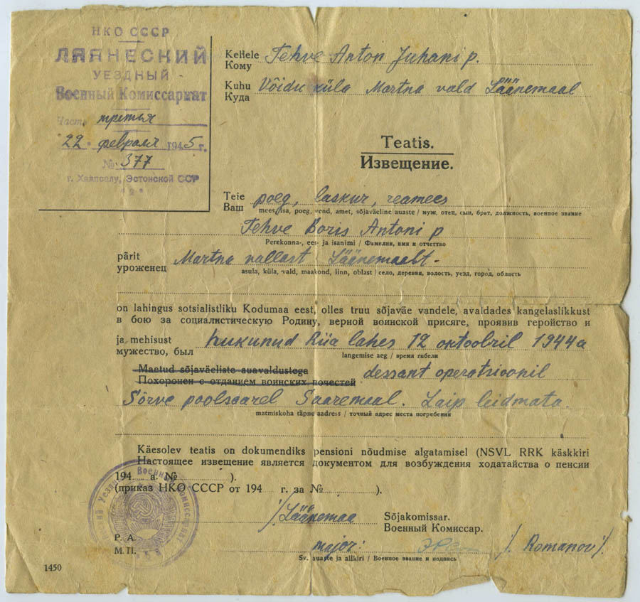 Mul üks samasugune teatis 1945. aasta veebruarist.