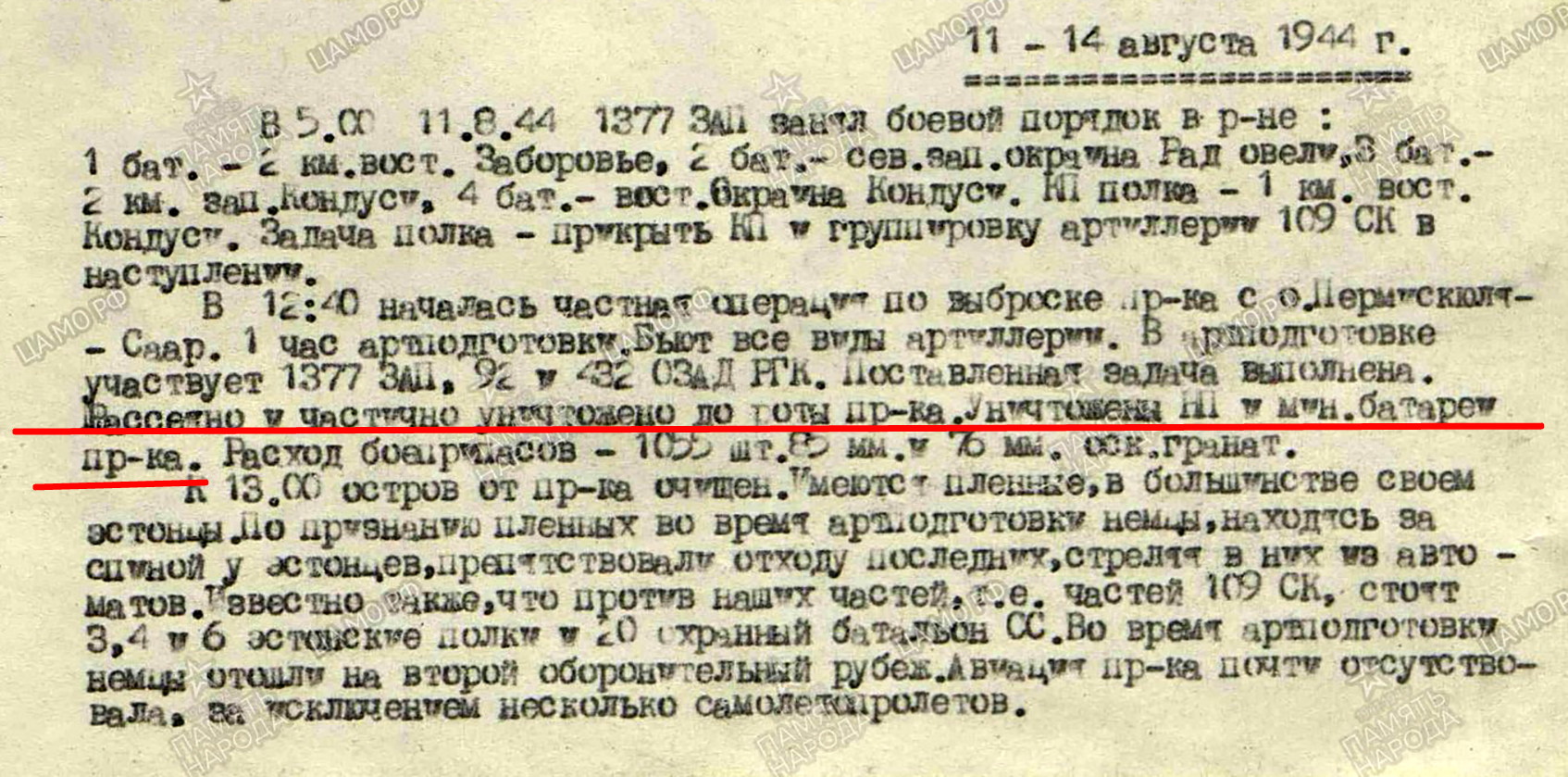 See on vist suurtükiväeüksuse sõjapäevik? 1377. õhutõrjepolk? Siin paistab olevat raporteeritud konkreetse üksuse väidetavatest saavutustest ehk siis suurtükiväelased lugesid olevat ühe kompanii jagu vastast laiali ajanud või hävitanud. Tegemist oli venelastel kohustusliku elemendiga raporteerimises - teatada kui suurt kahju vastasele tehti. Sellised hinnangud esitati sageli kõhutunde järgi või tegeleti lausfantaseerimisega ja tavaliselt ei vääri need äramärkimist. Kui esineb võetud vangide arv, siis seda võib reeglina enam-vähem õigeks lugeda. Kui esineb hävitatud tankide või liikursuurtükkide arv, siis võib maksimaalselt oletada, et mingi kokkupõrge vastase soomustehnikaga tõepoolest oli. Igatahes selle suurtükiväelaste jutu põhal ei maksa eriti kaugeleulatuvaid järeldusi kaitsjate kaotustest siiski teha