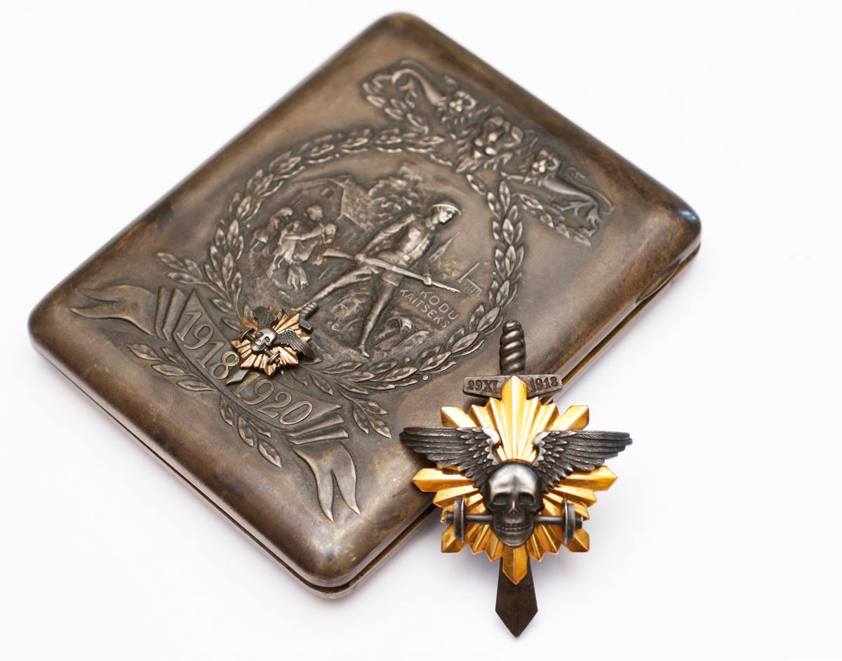 Permisküla saarel langenud II pataljoni ülemale, kapten Robert-Johannes Pärlist'i Soomusrongide rügemendi rinnamärk ja 1. Soomusrongirügemendi Ohvitseride Kogu poolt temale kingitud portsigar.