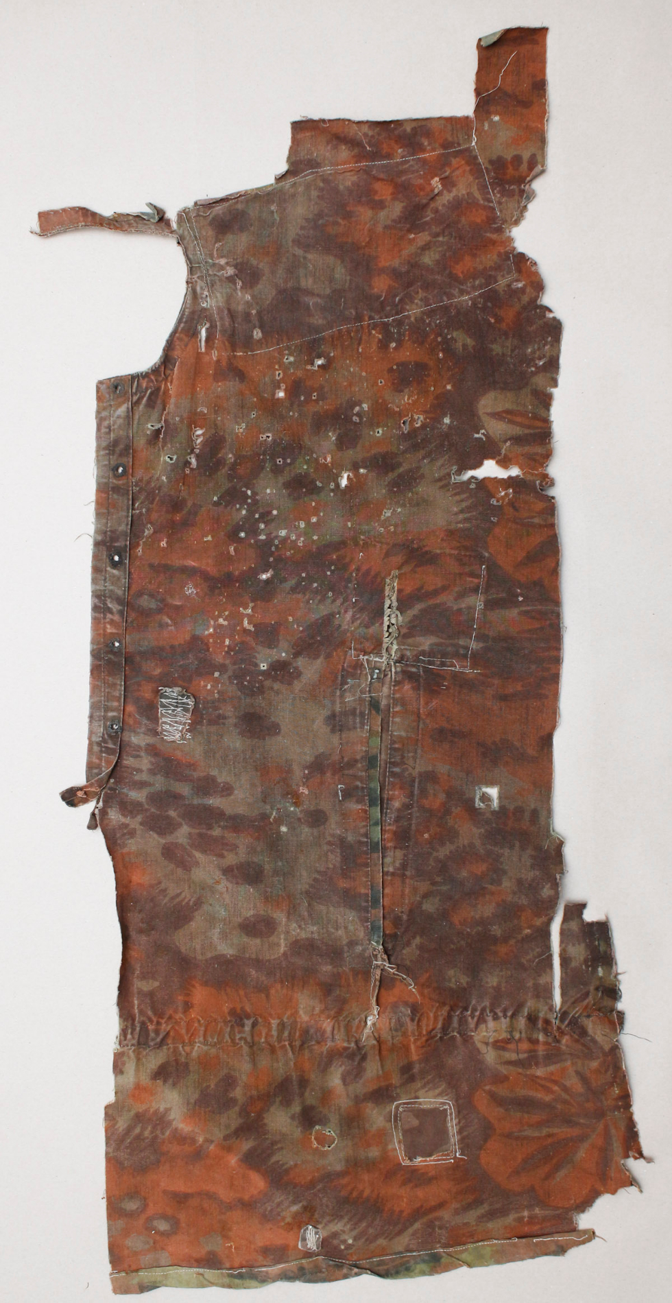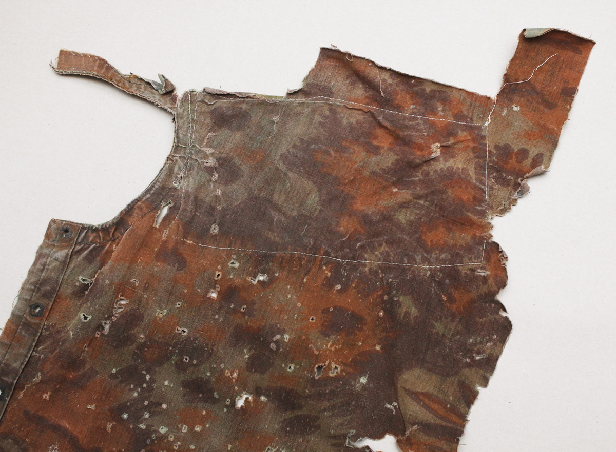 Natuke Palmimustriga maskeerimisjakki, kus on näha lausa viis sõjaaegset parandustööd.