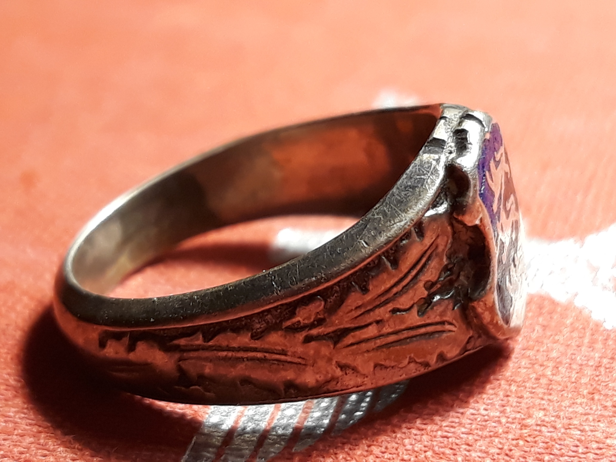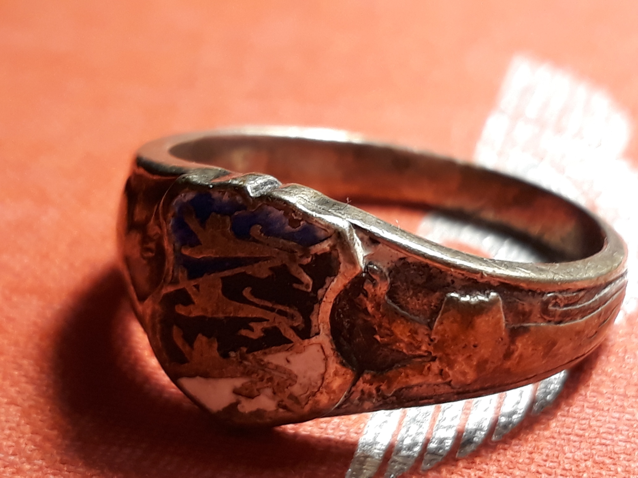 Teen siis kohe ka enda kollektsiooni tutvustamisega algust. Esimene sõrmus on huvitava rahvusliku motiiviga ja nagu on üsna tüüpiline, siis on sõrmusele kinnitatud vabariigi vapiga plaat (kuumemail). Markeeringud puuduvad, valmistatud arvatavasti kuskil 1930-ndatel.