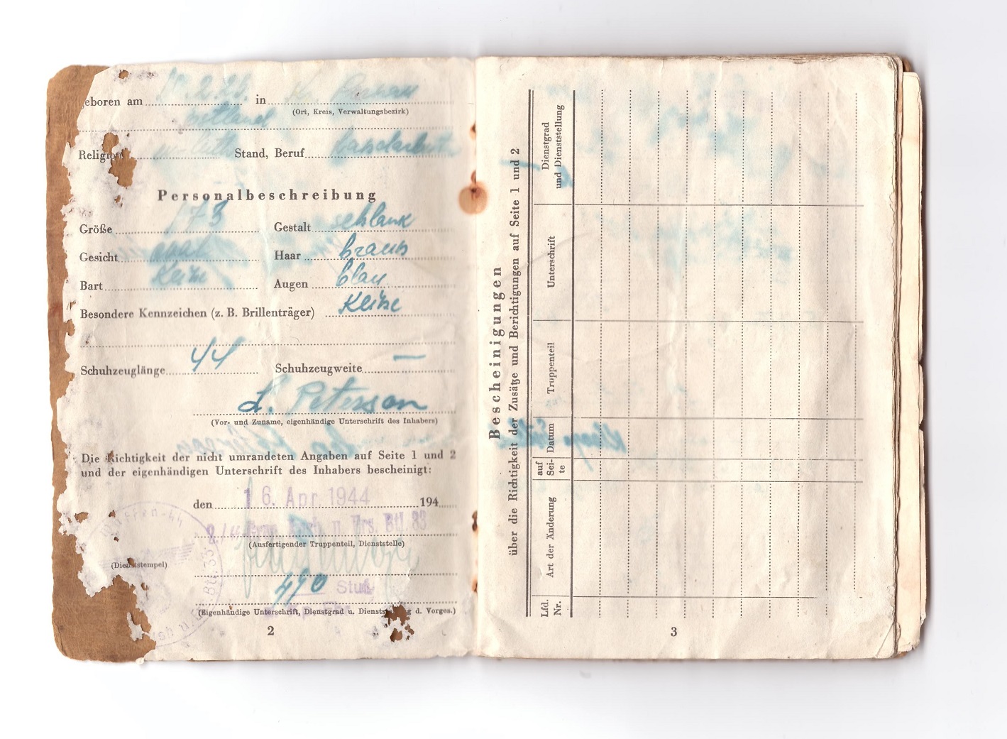 SS-Frw.O.Grenadier Leo Peterson´i Soldbuch. Klooga Soldbuchile omaselt on sissekandeid hõredalt. Küll aga leiab varustuslehelt huvitava märke, et talle on kätte jagatud Tarnjacke.
