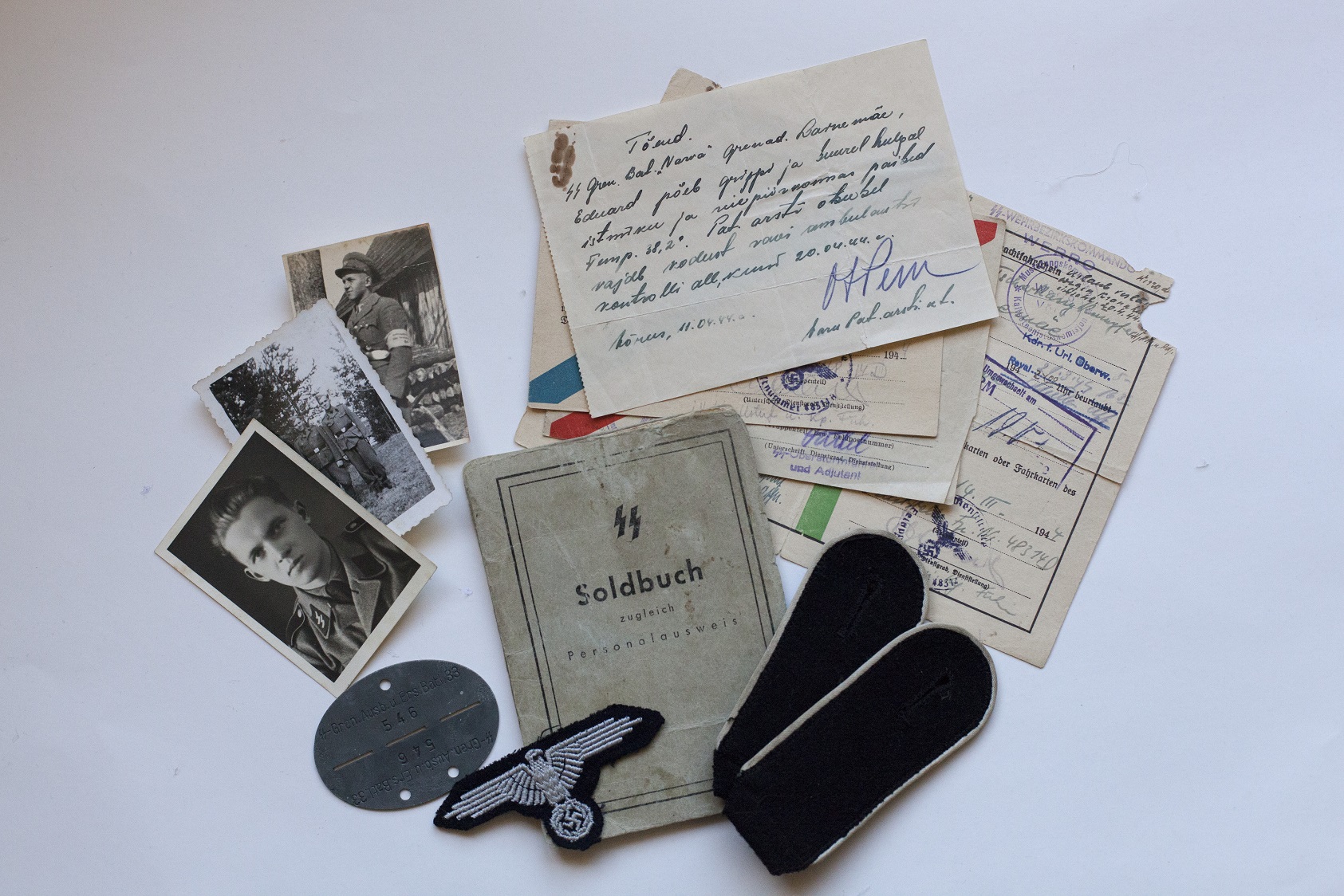 Eelpool kõne all olnud pataljon "Narwa" 3.kompaniisse kuulunud SS Grenadier Eduard Lainemäe Soldbuch ning muud dokumendid ja esemed.