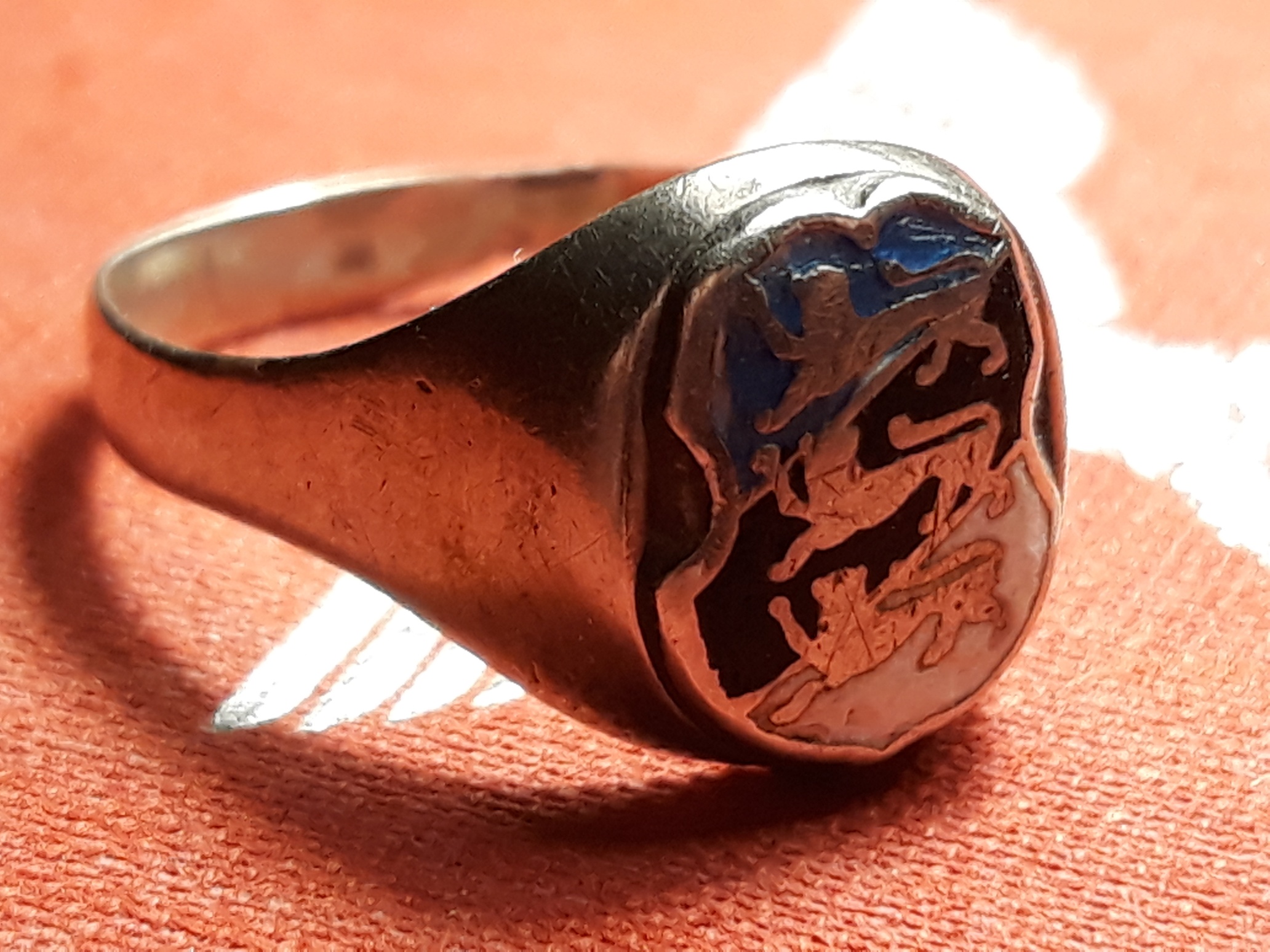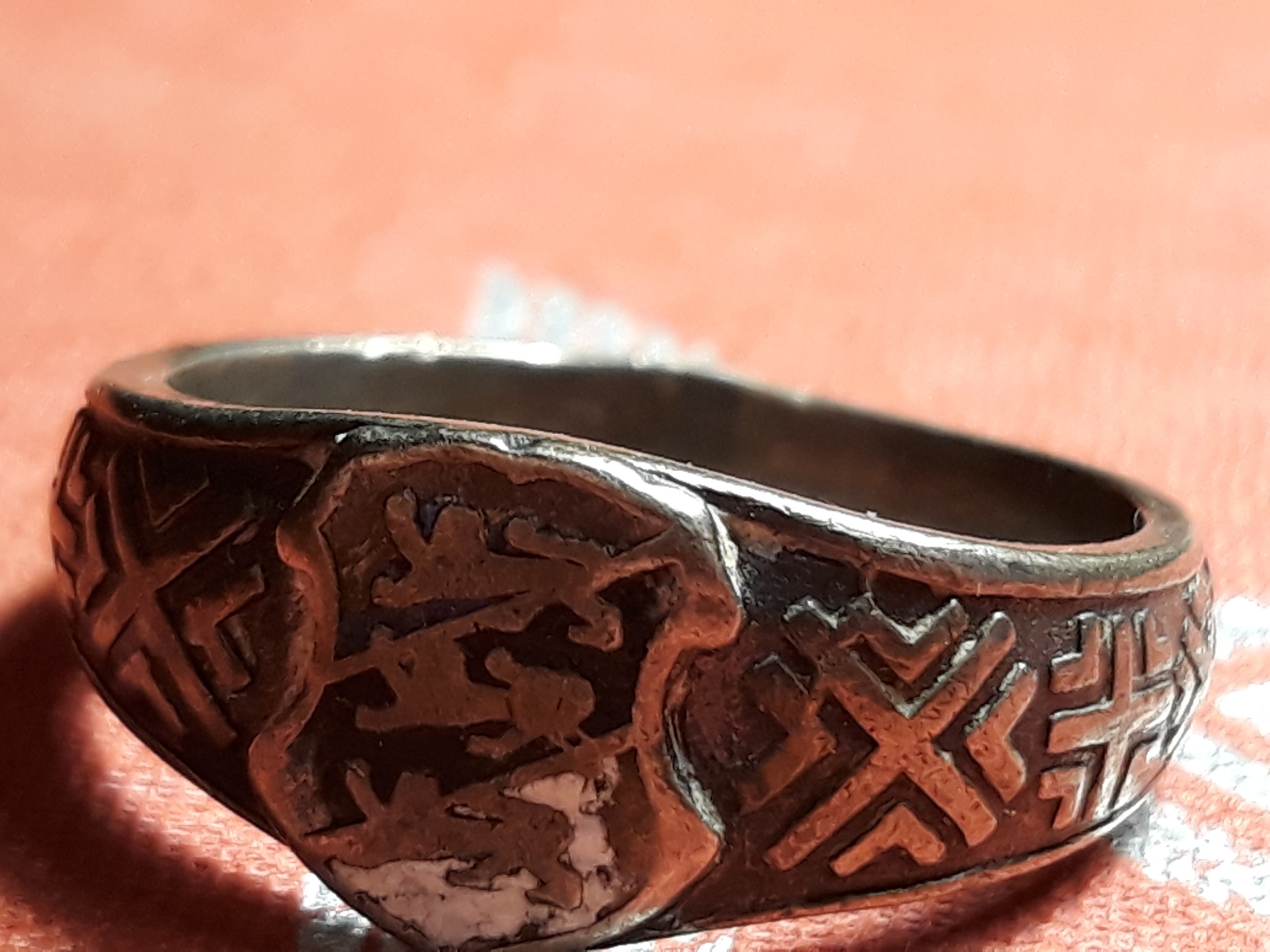 Teen siis kohe ka enda kollektsiooni tutvustamisega algust. Esimene sõrmus on huvitava rahvusliku motiiviga ja nagu on üsna tüüpiline, siis on sõrmusele kinnitatud vabariigi vapiga plaat (kuumemail). Markeeringud puuduvad, valmistatud arvatavasti kuskil 1930-ndatel.